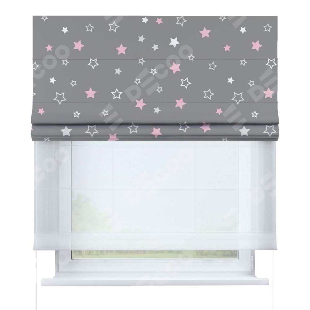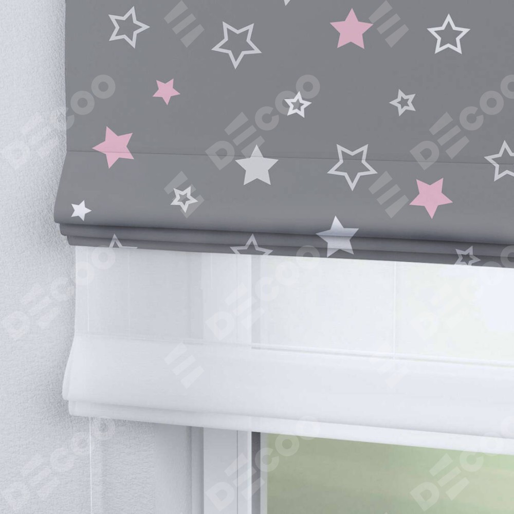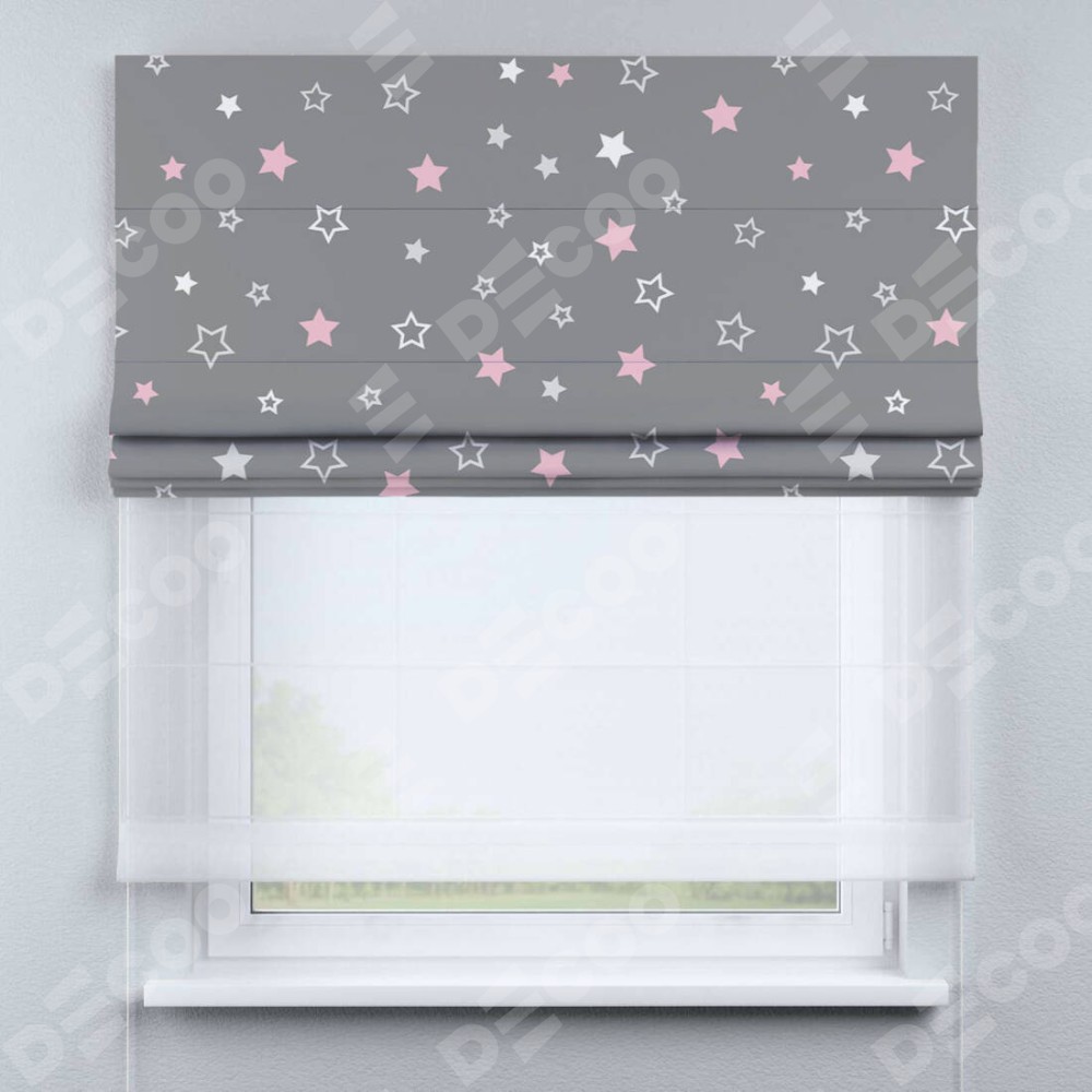 Двойная римская штора «День-ночь» от производителя Cortin предназначена для использования в проёмах. Эта штора уникальна тем, что состоит из двух полотен. На лицевой стороне находится блэкаут с нанесением сублимационной печати «Розовый звездопад», обеспечивающий эффективное затемнение. В комплект также входит вторая ткань — легкий белый тюль (артикул: V-01), который добавляет изящества и легкости оформлению окна. Кроме того, доступны и другие разновидности ткани тюль, выбор которых доступен по ссылке .