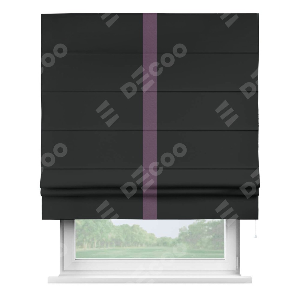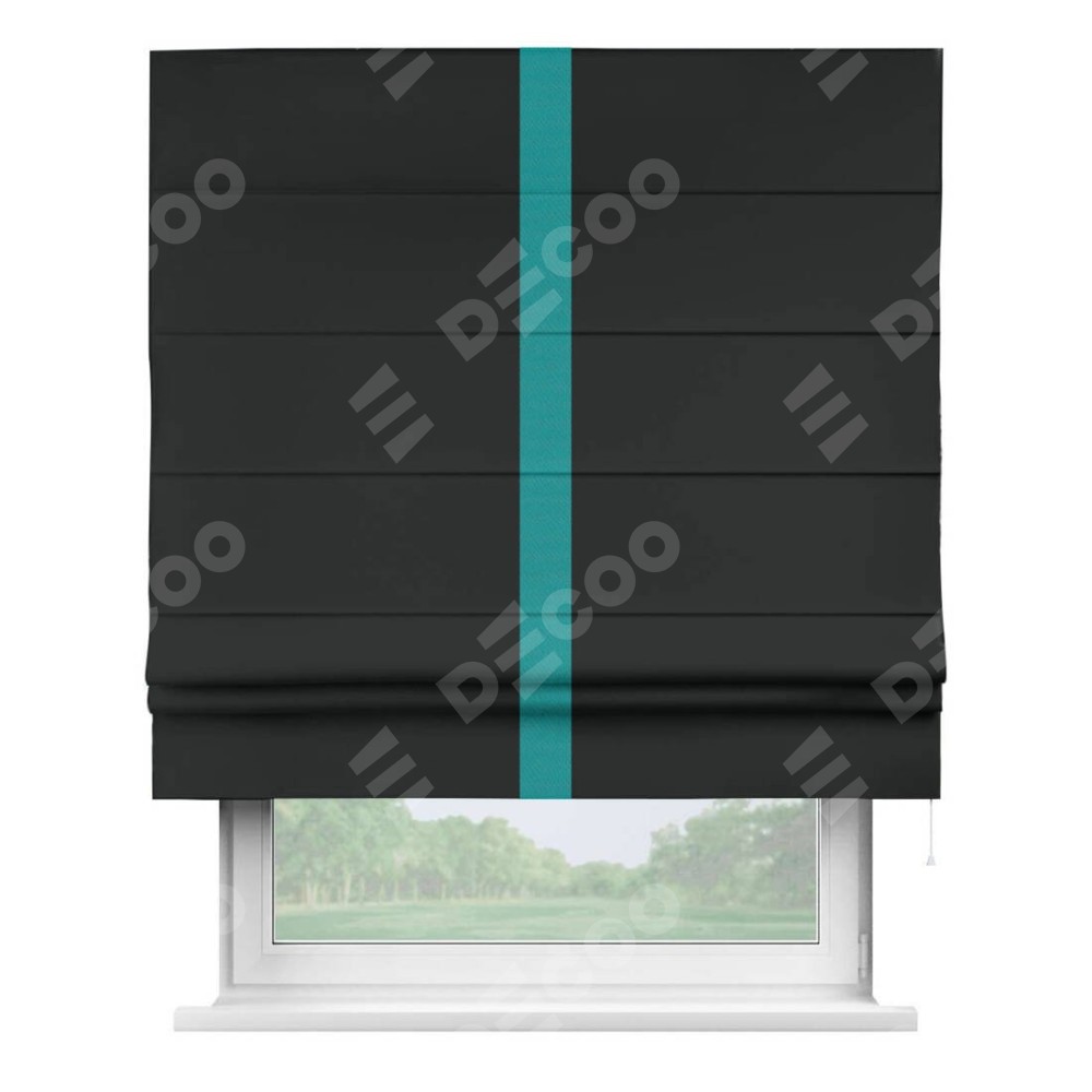Римская штора производителя «Cortin», используется для проёма, пошита из ткани блэкаут однотонный черный, артикул ткани 91571−2. Отделка шторы кантом «Хайвей», ткань для канта используется из блэкаута однотонного разной расцветки на выбор. Имеет универсальный механизм и подходит для монтажа: на потолок, на стену и в нишу.