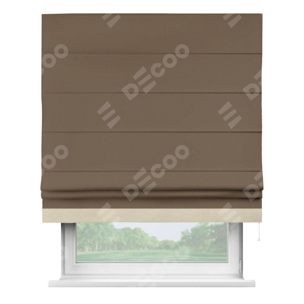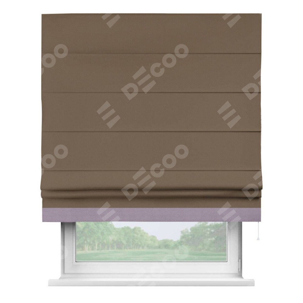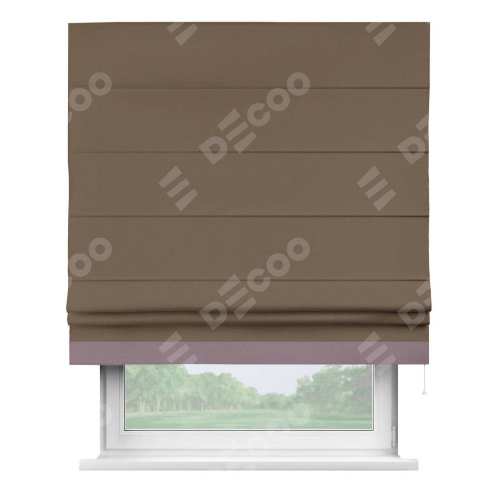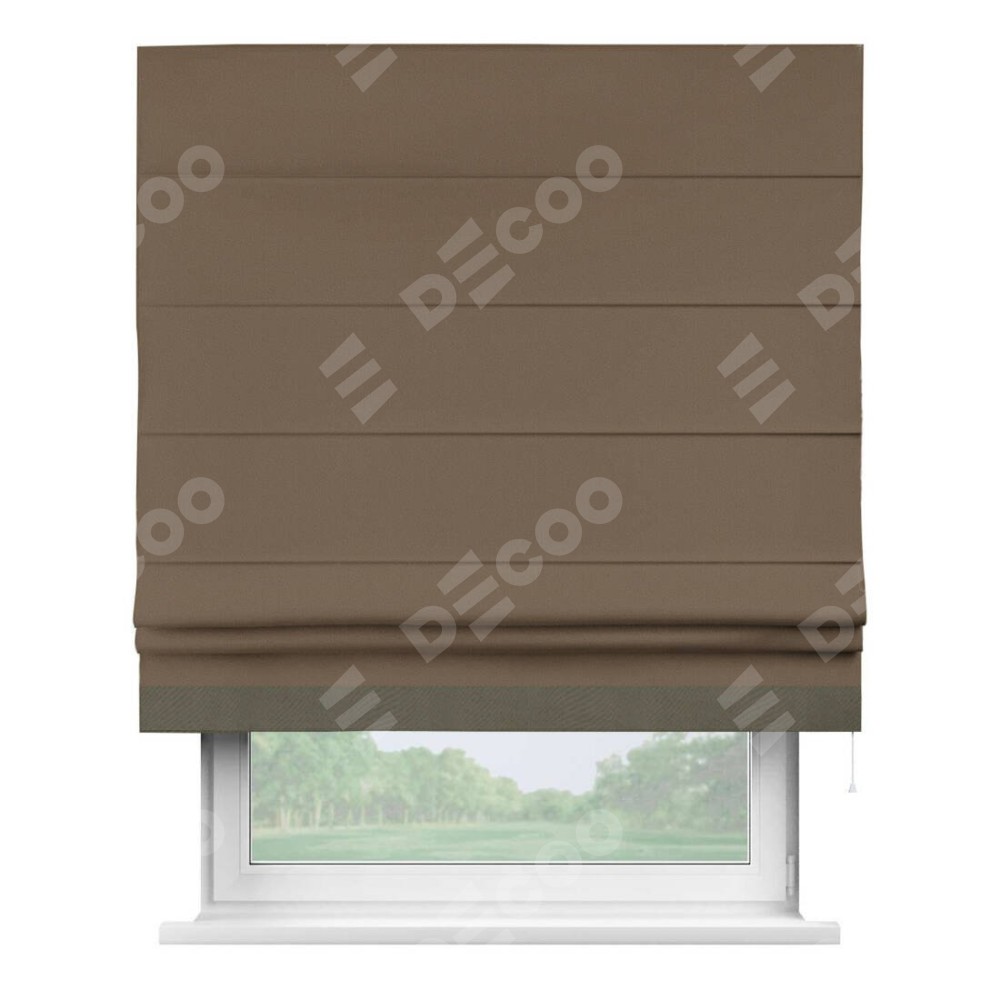 Римская штора производителя «Cortin», используется для проёма, пошита из ткани блэкаут однотонный коричневый, артикул ткани 91334. Отделка шторы кантом «Джестер», ткань для канта используется из блэкаута однотонного разной расцветки на выбор. Имеет универсальный механизм и подходит для монтажа: на потолок, на стену и в нишу.