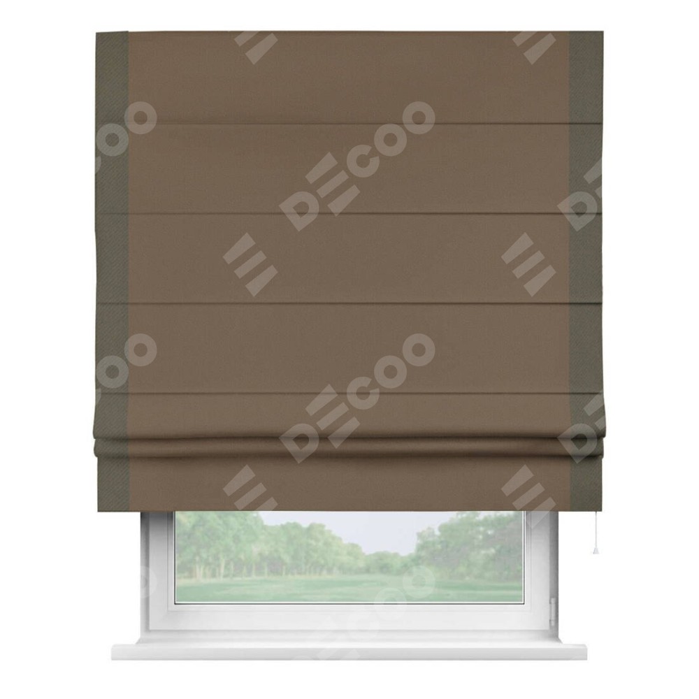 Римская штора производителя «Cortin», используется для проёма, пошита из ткани блэкаут однотонный коричневый, артикул ткани 91334. Отделка шторы кантом «Стрим Дуо», ткань для канта используется из блэкаута однотонного разной расцветки на выбор. Имеет универсальный механизм и подходит для монтажа: на потолок, на стену и в нишу.