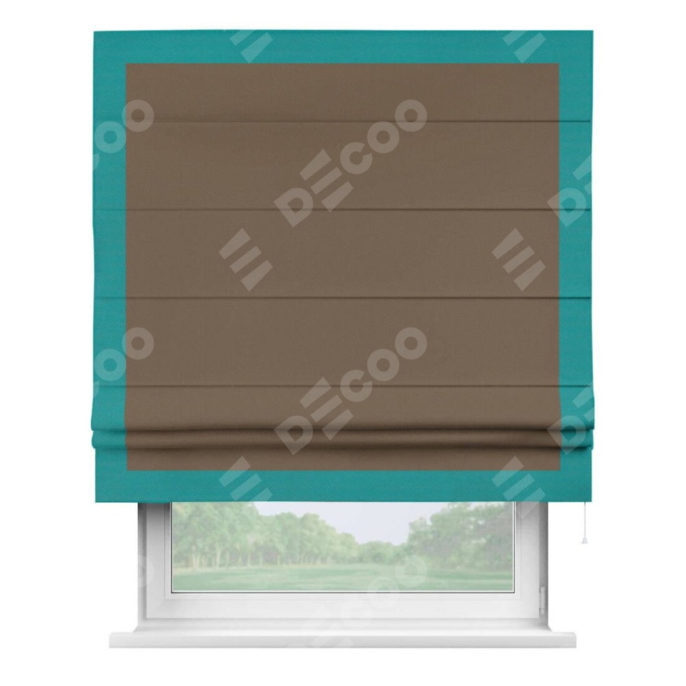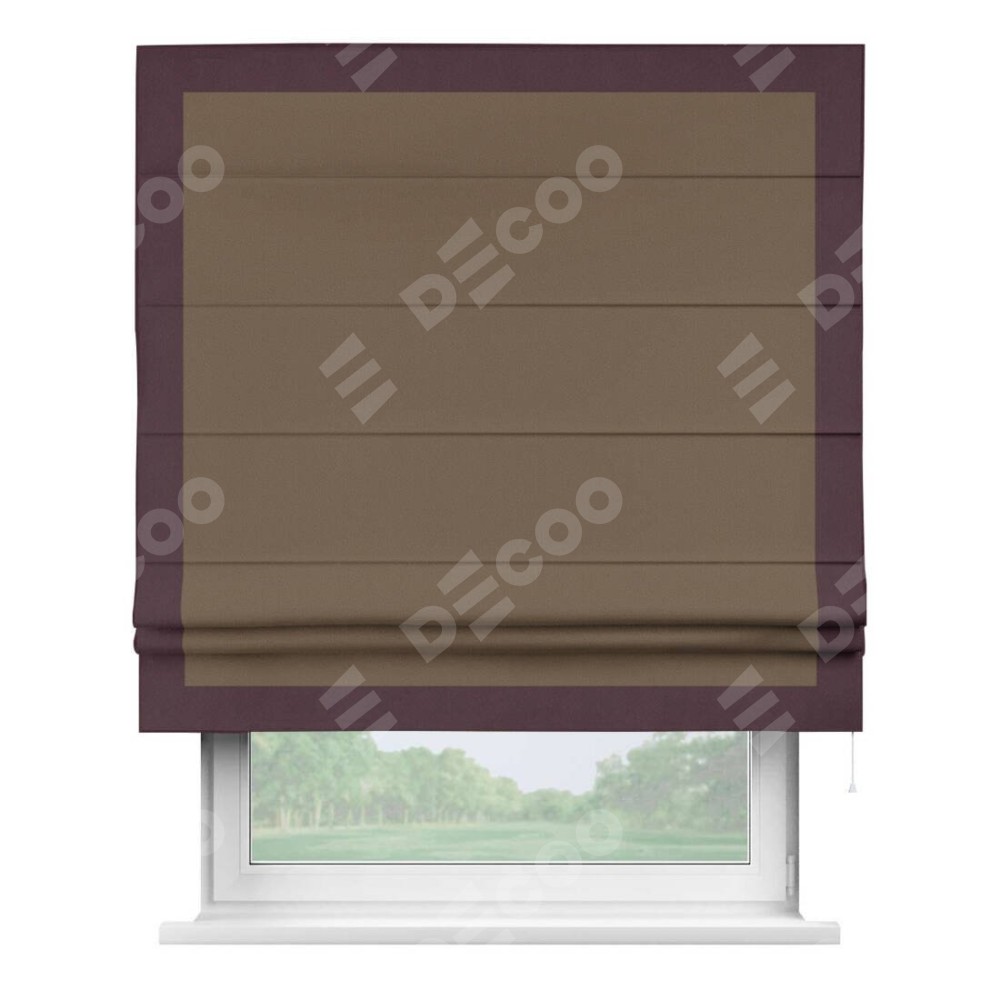 Римская штора производителя «Cortin», используется для проёма, пошита из ткани блэкаут однотонный коричневый, артикул ткани 91334. Отделка шторы кантом «Чесс», ткань для канта используется из блэкаута однотонного разной расцветки на выбор. Имеет универсальный механизм и подходит для монтажа: на потолок, на стену и в нишу.