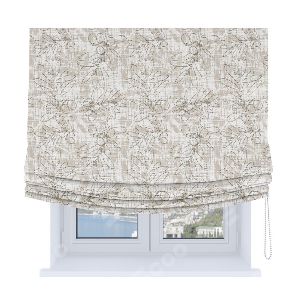 Римская штора Soft производителя «Cortin», используется для проёма, пошита из ткани блэкаут с нанесением сублимационной печати «Ветви оливы». Имеет универсальный механизм и подходит для монтажа: на потолок, на стену и в нишу. В отличие от стандартных римских штор, римская штора Soft не имеет горизонтальных вставок и нижнего отвеса. Это позволяет ткани произвольно драпироваться в свободные мягкие складки.
