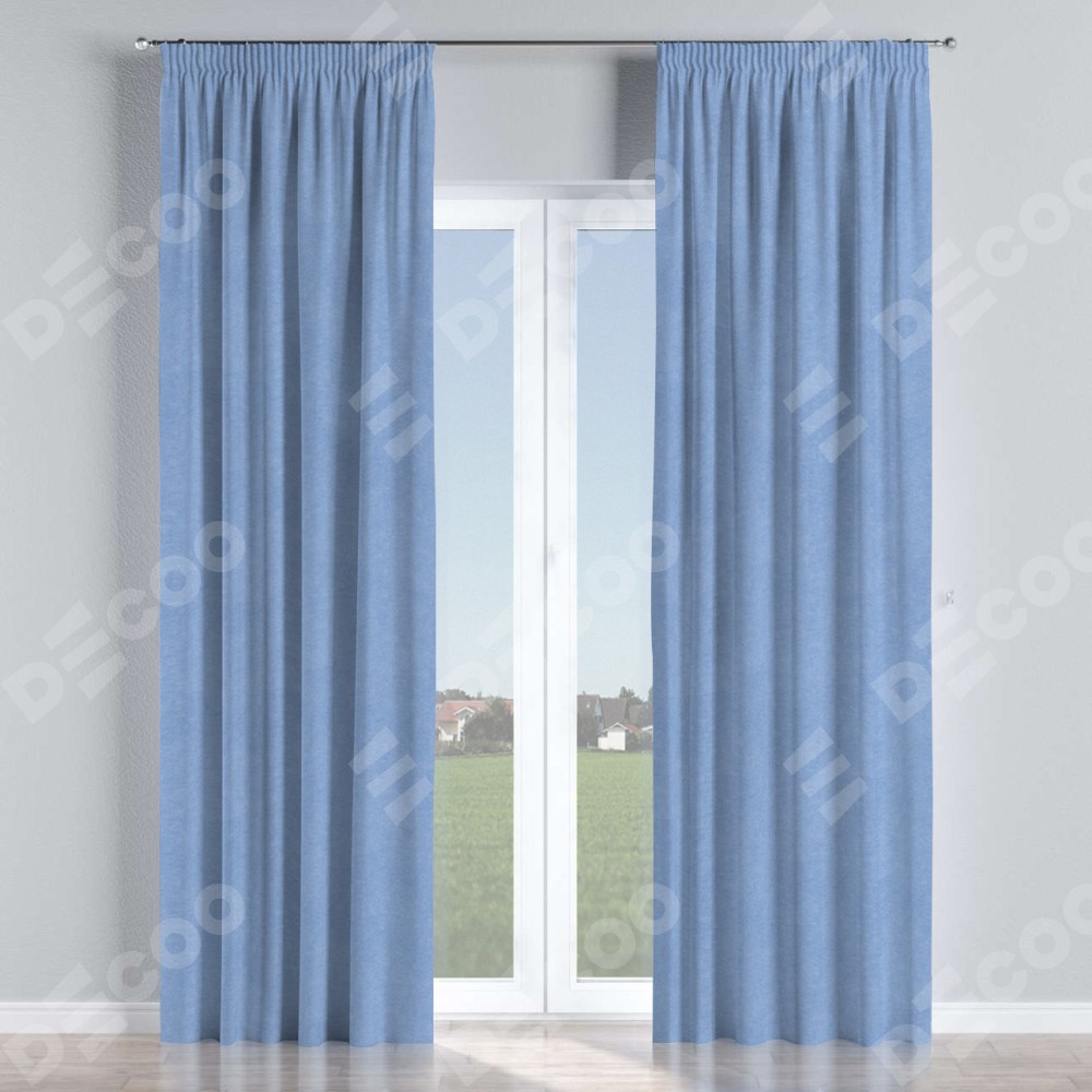 Комплект прямых штор, от производителя «Cortin», пошиты из ткани вельвет васильковый, артикул ткани 33799. С изнаночной стороны в верхней части штор пристрачивается шторная лента с декоративными складками «Карандаш». Для создания элегантных складок прямые шторы шьются по стандарту с коэффициентом 1:2 (на 100 см. ширины проёма 200 см. ширины ткани).