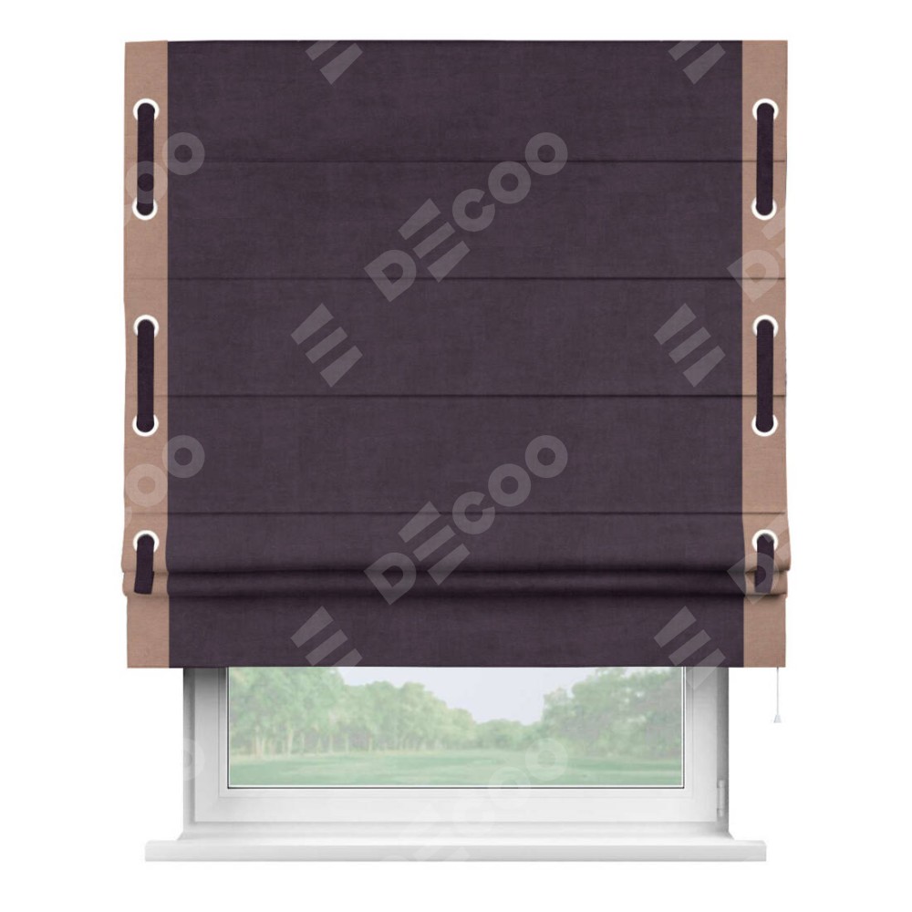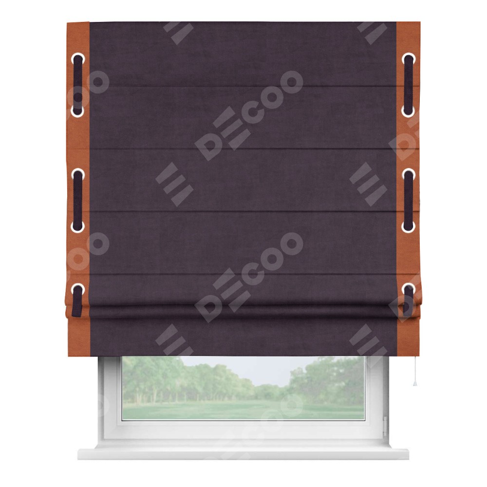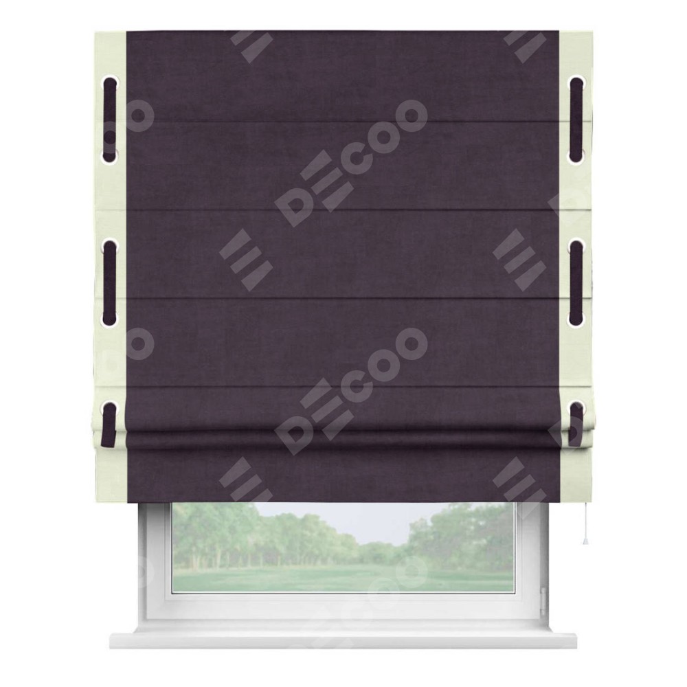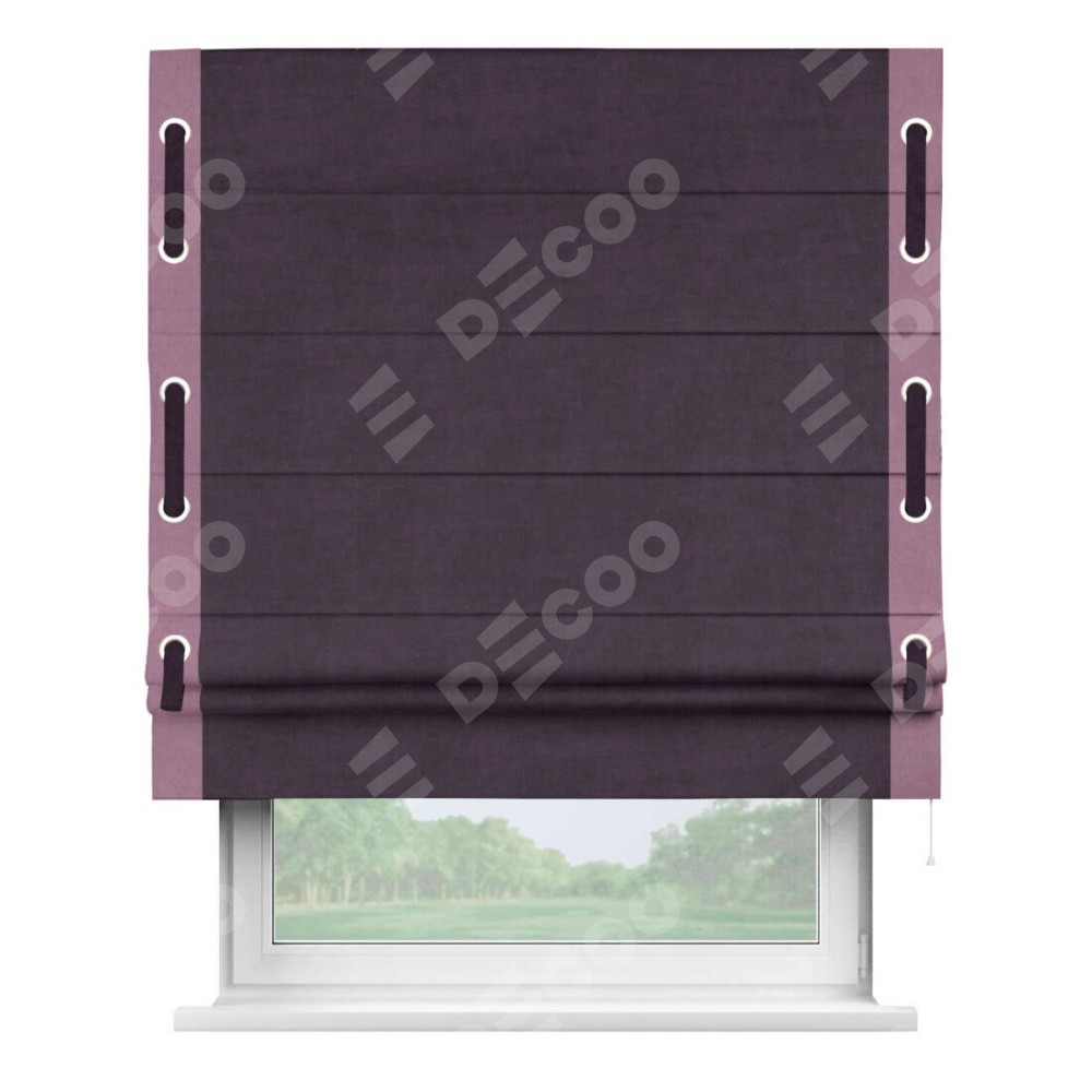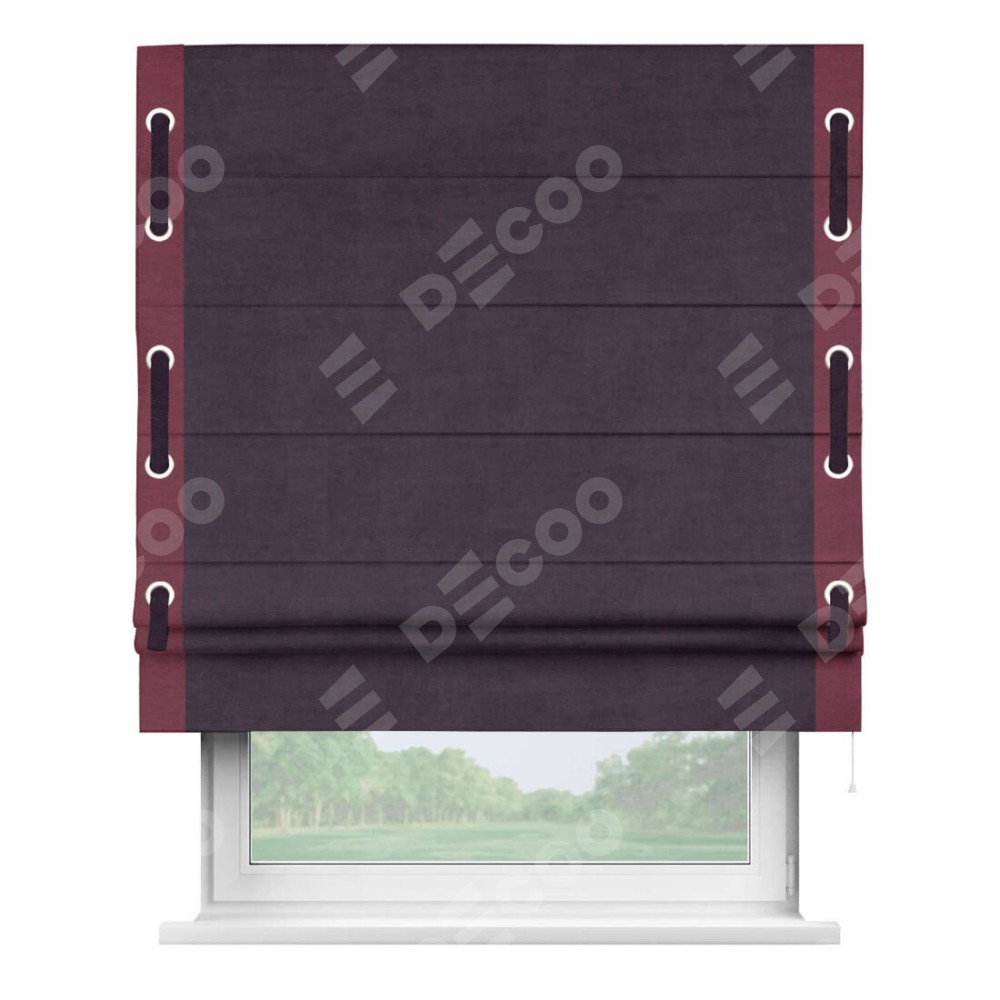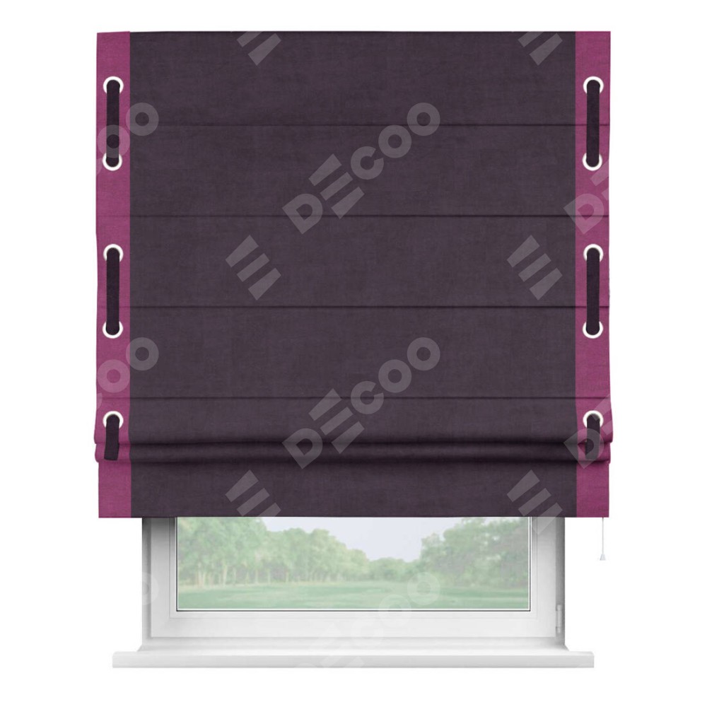 Римская штора производителя «Cortin», используется для проёма, пошита из ткани вельвет тёмно-фиолетовый, артикул ткани 72403. Отделка шторы кантом «Стрим Дуо» на кантах расположены люверсы с пояском, ткань для канта используется из вельвета разной расцветки на выбор. Ткань для пояска обычно используется из основной ткани шторы, а так же можно сделать из любой расцветки по желанию. Имеет универсальный механизм и подходит для монтажа: на потолок, на стену и в нишу.