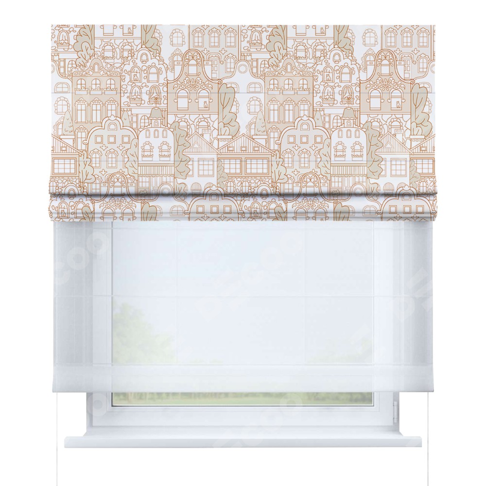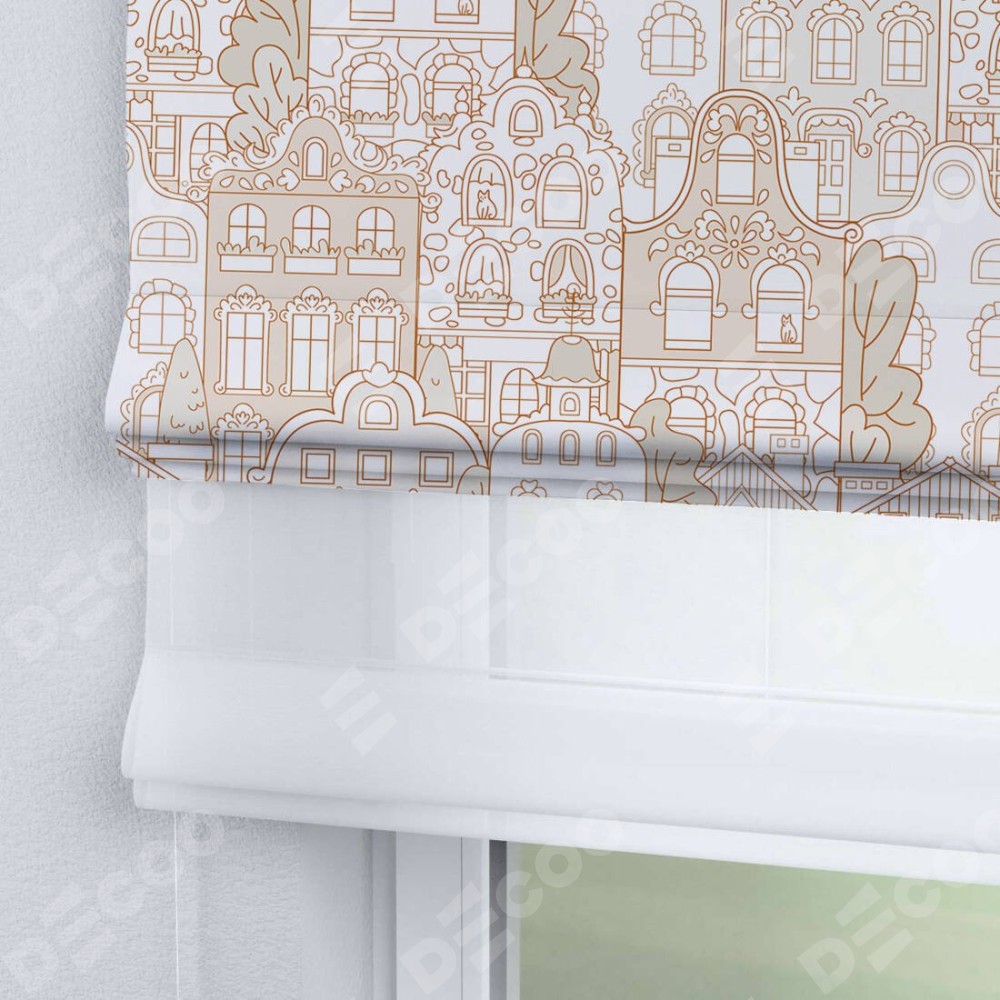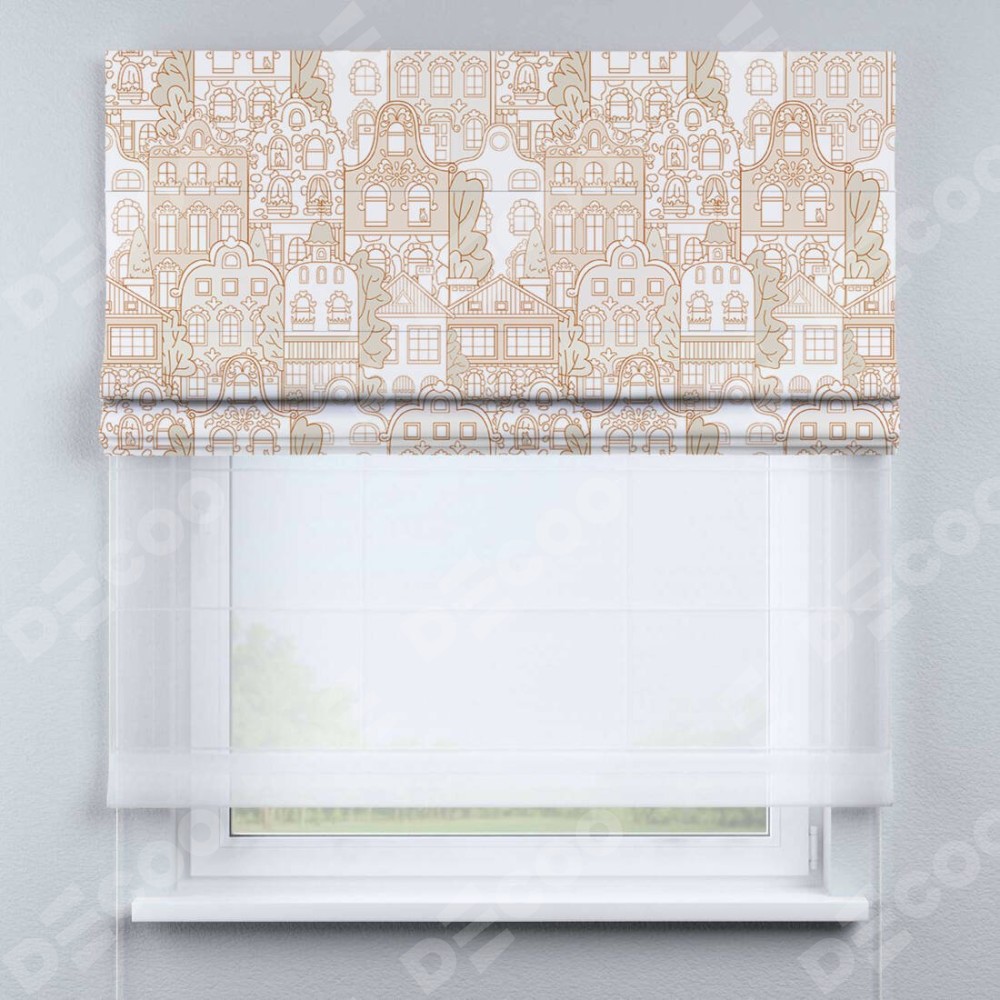 Двойная римская штора «День-ночь» от производителя Cortin предназначена для использования в проёмах. Эта штора уникальна тем, что состоит из двух полотен. На лицевой стороне находится блэкаут с нанесением сублимационной печати «Милый городок», обеспечивающий эффективное затемнение. В комплект также входит вторая ткань — легкий белый тюль (артикул: V-01), который добавляет изящества и легкости оформлению окна. Кроме того, доступны и другие разновидности ткани тюль, выбор которых доступен по  ссылке .