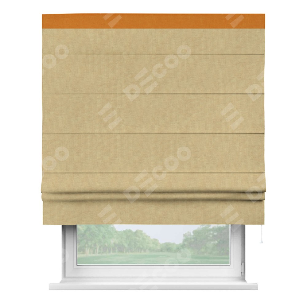 Римская штора производителя «Cortin», используется для проёма, пошита из ткани канвас абрикосовый, артикул ткани v-448. Отделка шторы кантом «Кинг» (оранжевый v-106), ткань для канта используется из канваса разной расцветки на выбор. Имеет универсальный механизм и подходит для монтажа: на потолок, на стену и в нишу.
