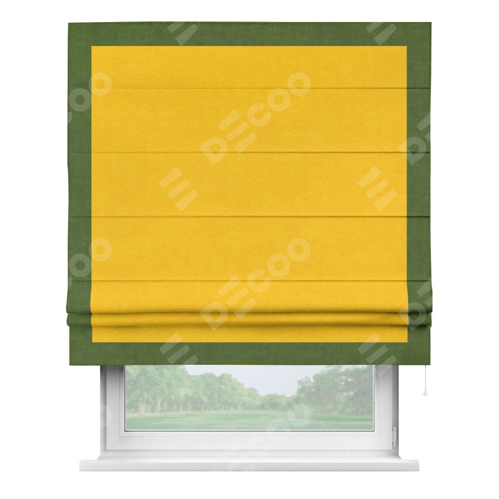 Римская штора производителя «Cortin», используется для проёма, пошита из ткани канвас желтый, артикул ткани v-344. Отделка шторы кантом «Чесс» (трава v-473), ткань для канта используется из канваса разной расцветки на выбор. Имеет универсальный механизм и подходит для монтажа: на потолок, на стену и в нишу.
