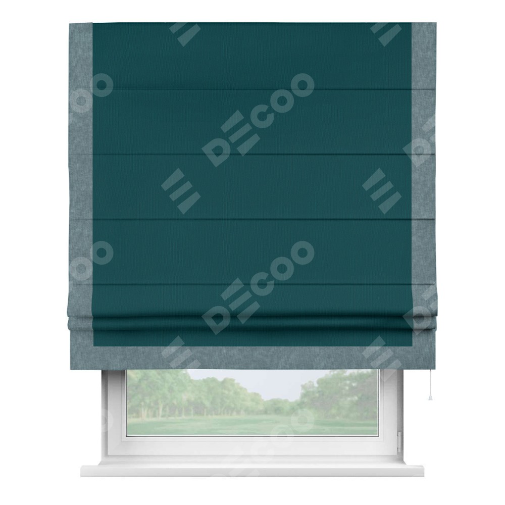 Римская штора производителя «Cortin», используется для проёма, пошита из ткани канвас изумрудный, артикул ткани v-12487. Отделка шторы кантом «Виктория» (серо-голубой v-330), ткань для канта используется из канваса разной расцветки на выбор. Имеет универсальный механизм и подходит для монтажа: на потолок, на стену и в нишу.