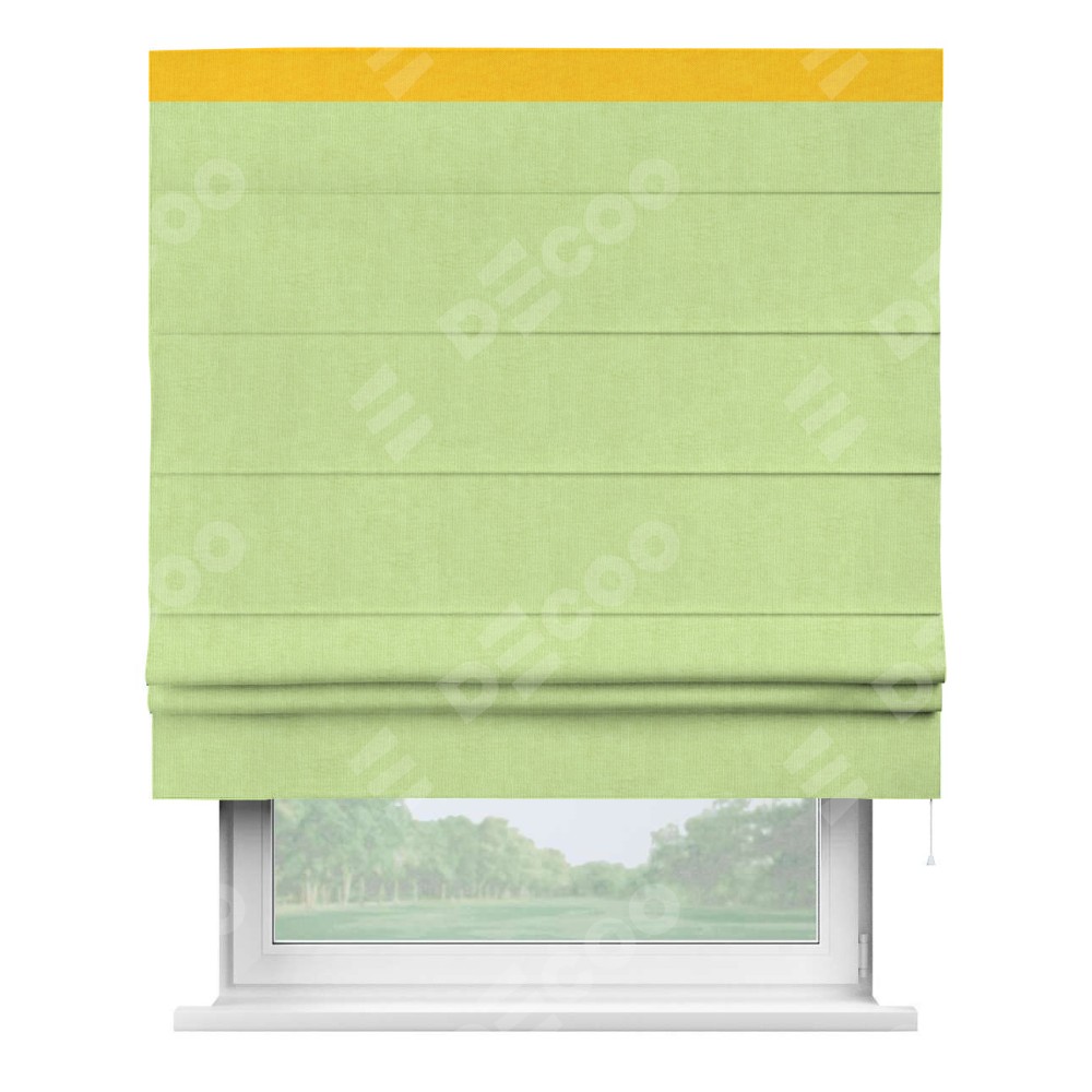 Римская штора производителя «Cortin», используется для проёма, пошита из ткани канвас липовый, артикул ткани v-207. Отделка шторы кантом «Кинг» (желтый v-344), ткань для канта используется из канваса разной расцветки на выбор. Имеет универсальный механизм и подходит для монтажа: на потолок, на стену и в нишу.