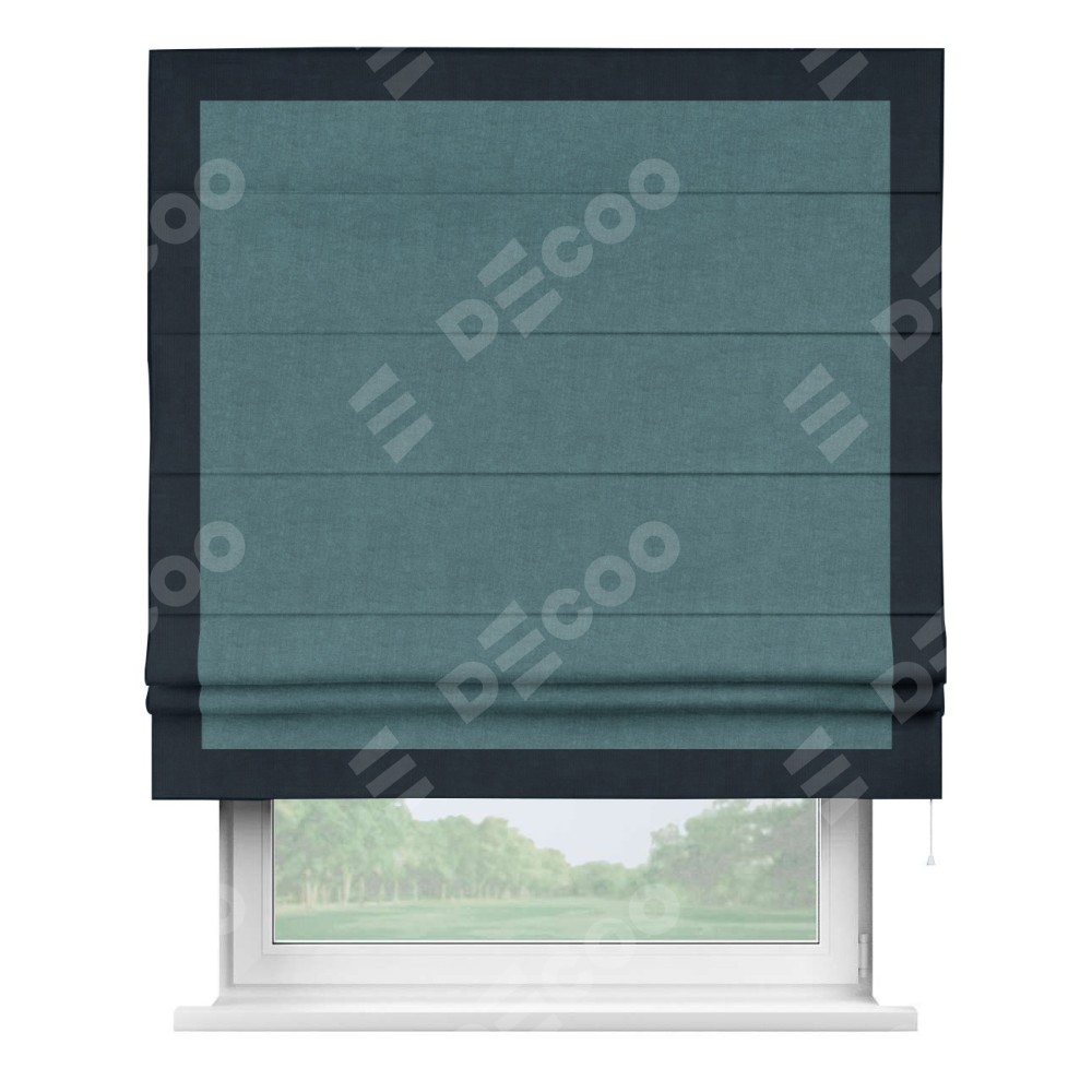 Римская штора производителя «Cortin», используется для проёма, пошита из ткани канвас ментоловый, артикул ткани v-114. Отделка шторы кантом «Чесс» (тёмно-синий v-206), ткань для канта используется из канваса разной расцветки на выбор. Имеет универсальный механизм и подходит для монтажа: на потолок, на стену и в нишу.