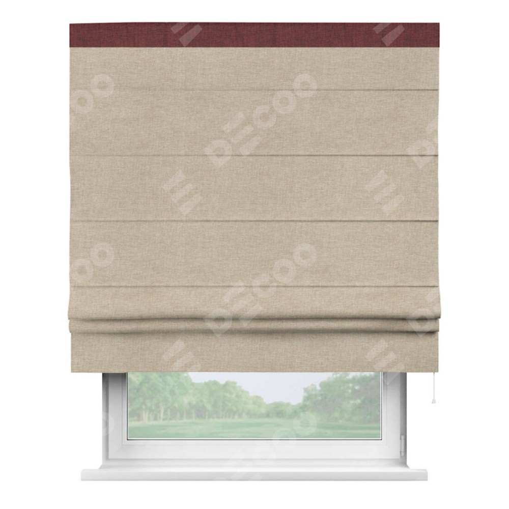 Римская штора производителя «Cortin», используется для проёма, пошита из ткани лён кашемир бежевый, артикул 17206. Отделка шторы кантом «Кинг», ткань для канта используется из льна разной расцветки на выбор. Имеет универсальный механизм и подходит для монтажа: на потолок, на стену и в нишу.