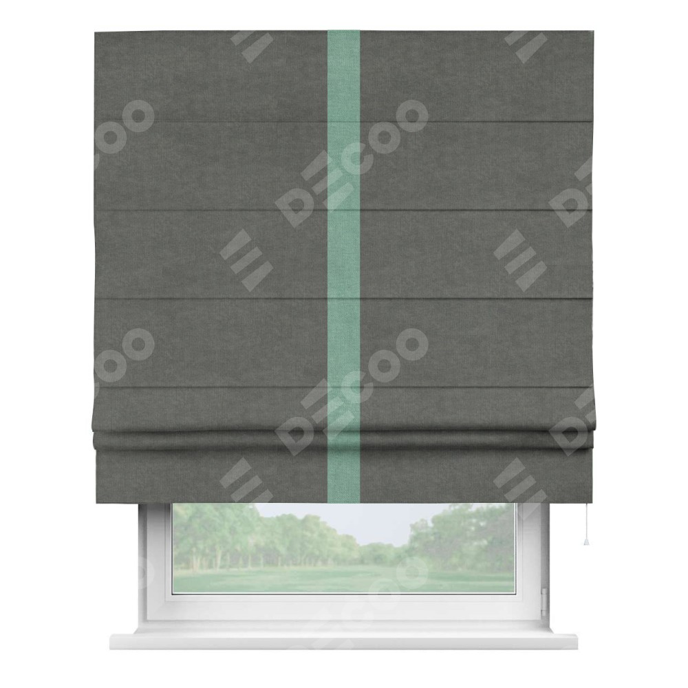 Римская штора производителя «Cortin», используется для проёма, пошита из ткани канвас тёмно-серый, артикул ткани v-340. Отделка шторы кантом «Хайвей» (мятный v-248), ткань для канта используется из канваса разной расцветки на выбор. Имеет универсальный механизм и подходит для монтажа: на потолок, на стену и в нишу.