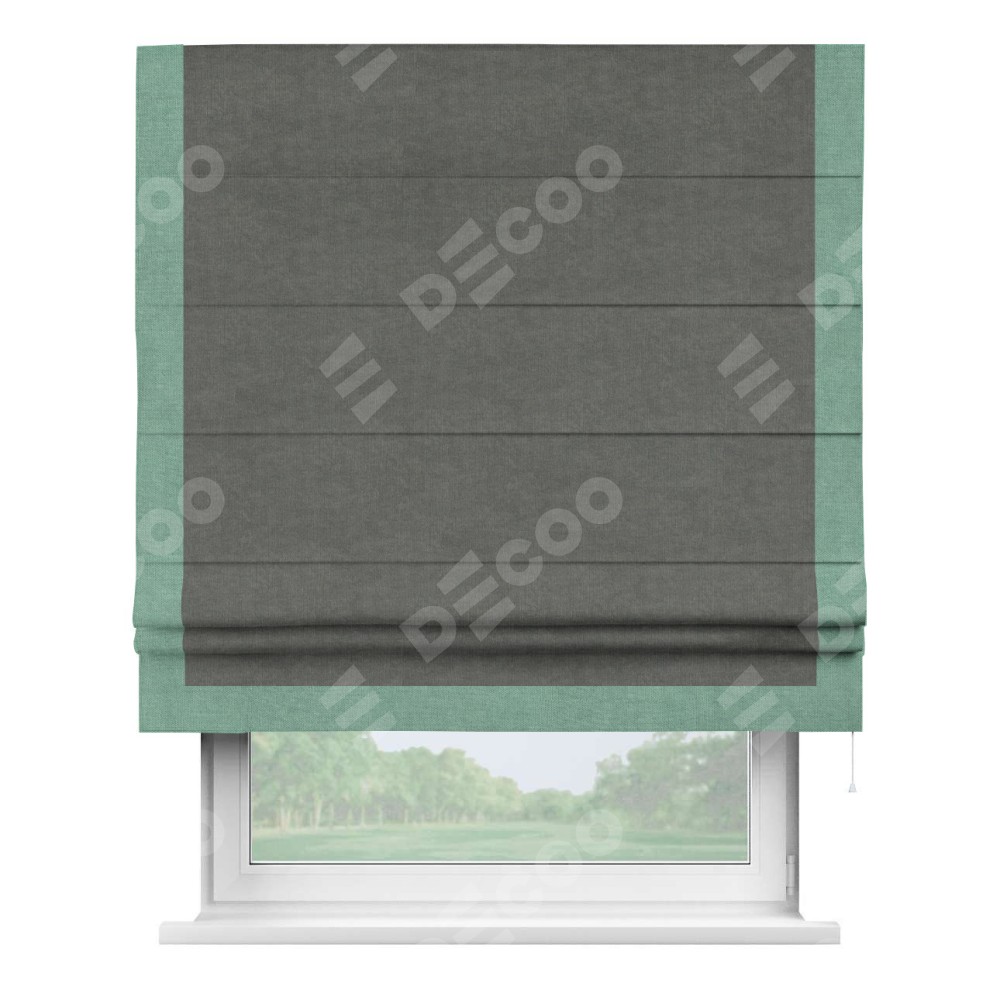 Римская штора производителя «Cortin», используется для проёма, пошита из ткани канвас тёмно-серый, артикул ткани v-340. Отделка шторы кантом «Виктория» (мятный v-248), ткань для канта используется из канваса разной расцветки на выбор. Имеет универсальный механизм и подходит для монтажа: на потолок, на стену и в нишу.