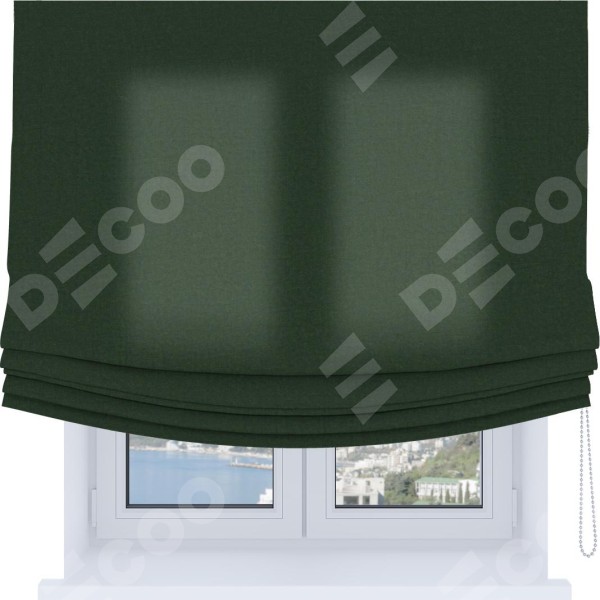 Римская штора Soft производителя «Cortin», используется для проёма, пошита из ткани канвас глубокий зелёный, артикул ткани v-588. Имеет универсальный механизм и подходит для монтажа: на потолок, на стену и в нишу. В отличие от стандартных римских штор, римская штора Soft не имеет горизонтальных вставок и нижнего отвеса. Это позволяет ткани произвольно драпироваться в свободные мягкие складки.