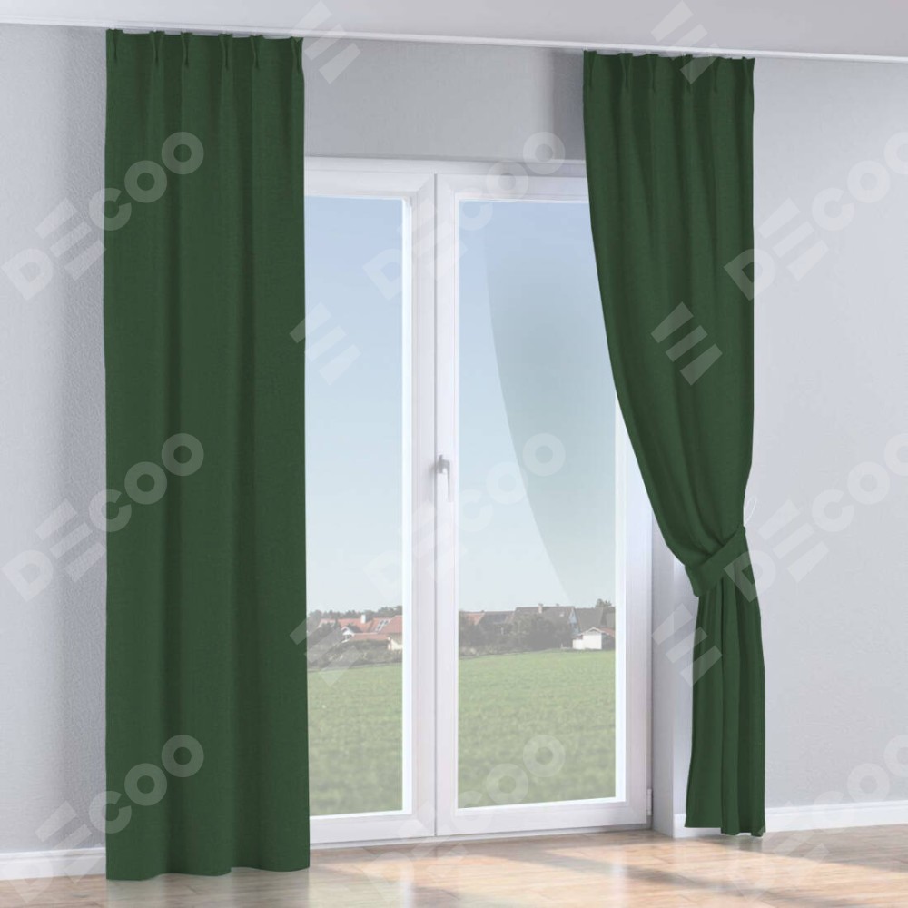 Комплект прямых штор, от производителя «Cortin», пошиты из ткани канвас глубокий зелёный, артикул ткани v-588. С изнаночной стороны в верхней части штор пристрачивается шторная лента с декоративными складками «Кустик». Для создания элегантных складок прямые шторы шьются по стандарту с коэффициентом 1:2 (на 100 см. ширины проёма 200 см. ширины ткани).