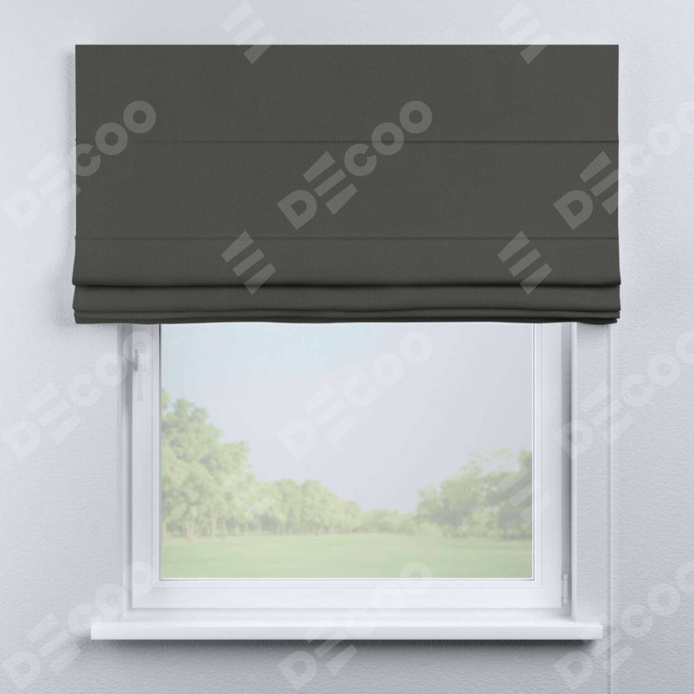 Классическая римская штора производителя «Cortin», пошита из ткани однотонный блэкаут тёмно-серый, артикул: 91570. Имеет универсальный механизм и подходит для монтажа: на потолок, на стену и в нишу.