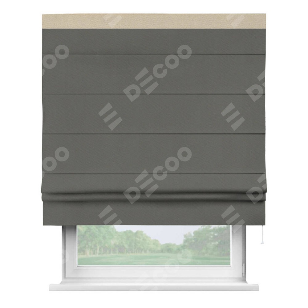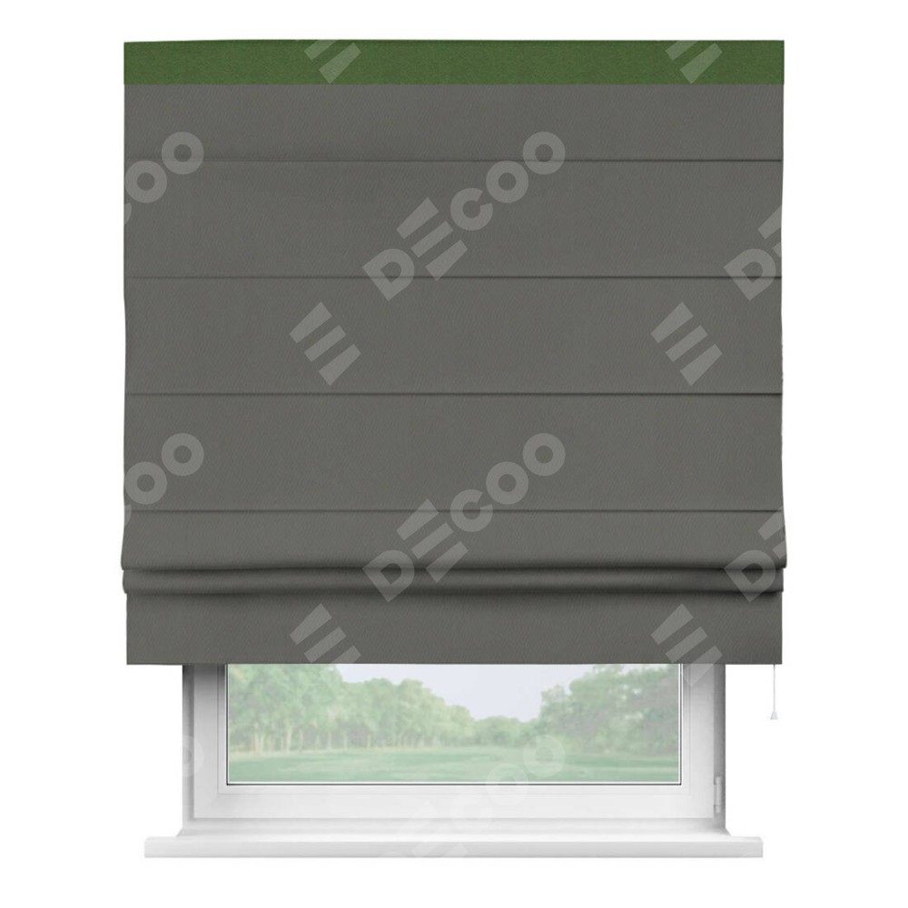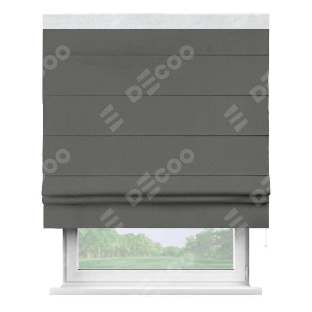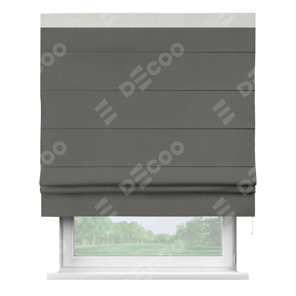 Римская штора производителя «Cortin», используется для проёма, пошита из ткани блэкаут однотонный тёмно-серый, артикул ткани 91570. Отделка шторы кантом «Кинг», ткань для канта используется из блэкаута однотонного разной расцветки на выбор. Имеет универсальный механизм и подходит для монтажа: на потолок, на стену и в нишу.