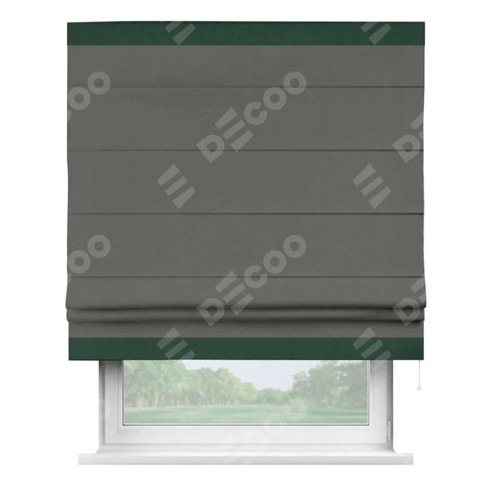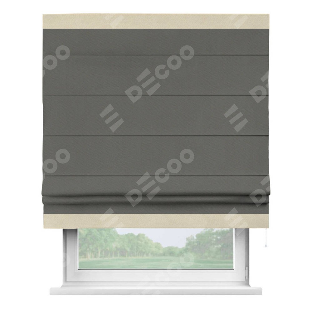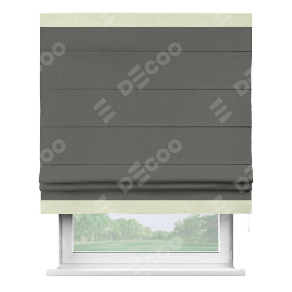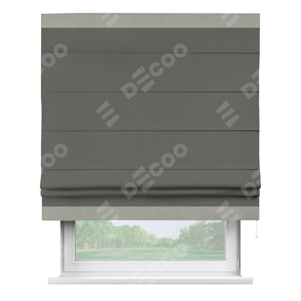 Римская штора производителя «Cortin», используется для проёма, пошита из ткани блэкаут однотонный тёмно-серый, артикул ткани 91570. Отделка шторы кантом «Горизонт», ткань для канта используется из блэкаута однотонного разной расцветки на выбор. Имеет универсальный механизм и подходит для монтажа: на потолок, на стену и в нишу.