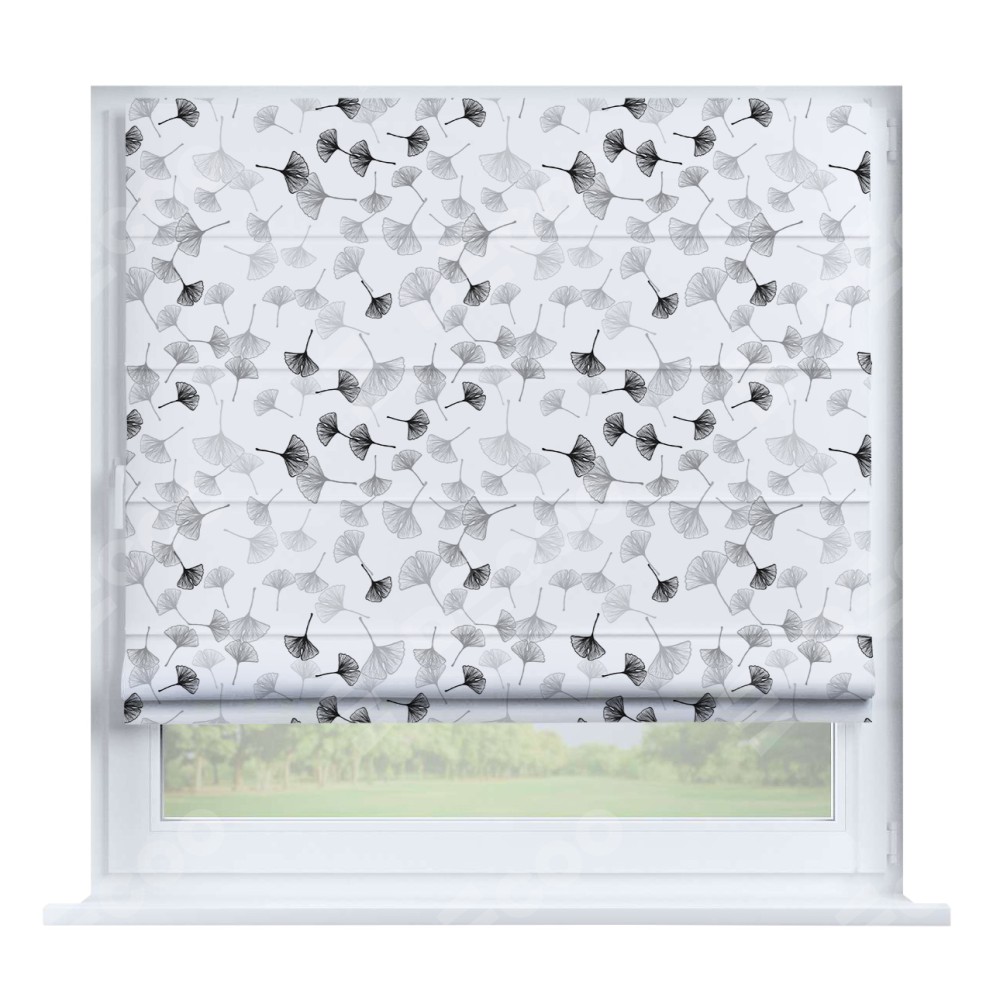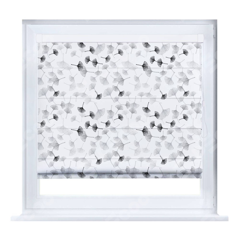 Римская штора производителя «Cortin», устанавливается на створку окна, пошита из ткани блэкаут с нанесением сублимационной печати «Дымчатые листочки». Штора шьётся по индивидуальным размерам, для данного типа римской шторы возможная ширина от 35 до 150 см., высота до 250 см.