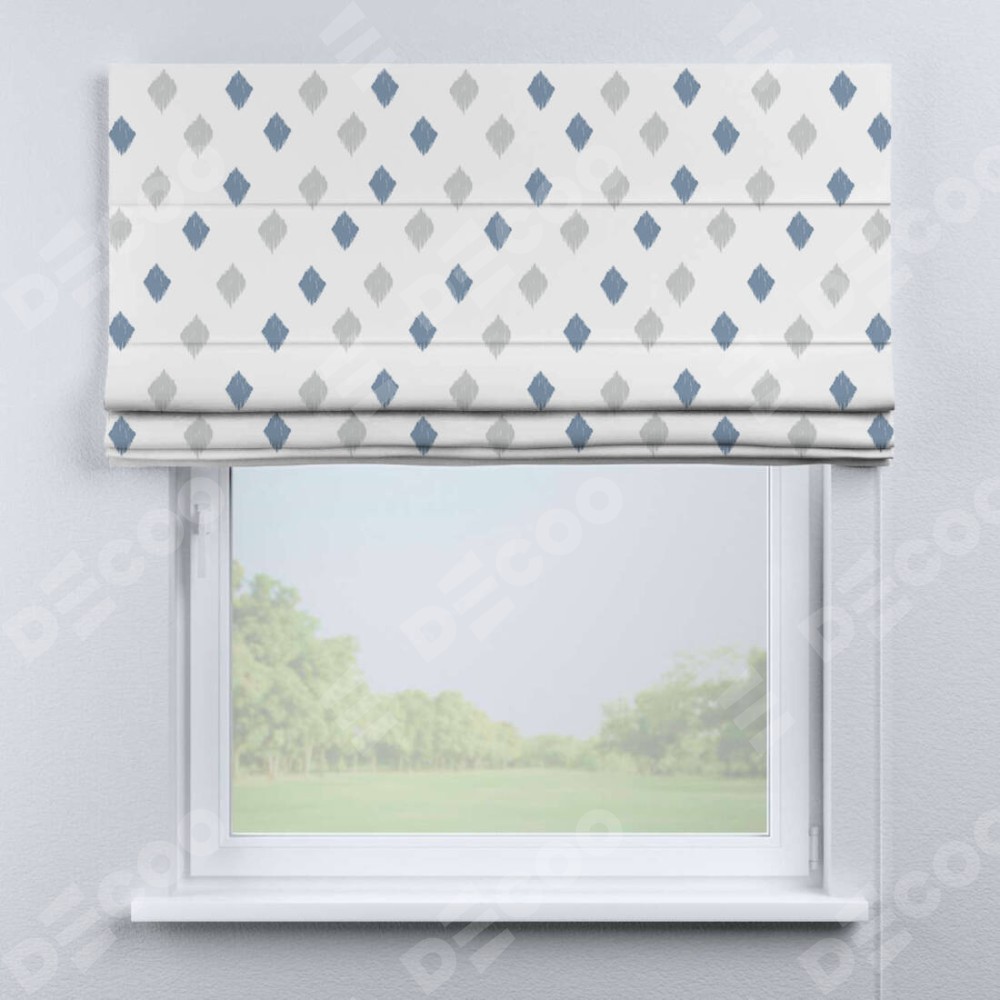 Классическая римская штора производителя «Cortin», пошита из ткани блэкаут с нанесением сублимационной печати «Икат ромбики». Имеет универсальный механизм и подходит для монтажа: на потолок, на стену и в нишу.
