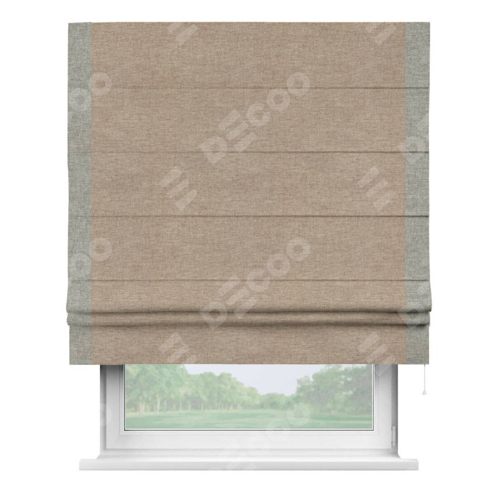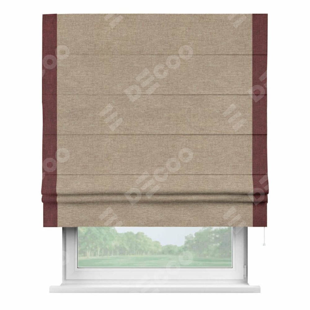 Римская штора производителя «Cortin», используется для проёма, пошита из ткани лён кашемир коричневый, артикул 21614. Отделка шторы кантом «Стрим Дуо», ткань для канта используется из льна разной расцветки на выбор. Имеет универсальный механизм и подходит для монтажа: на потолок, на стену и в нишу.