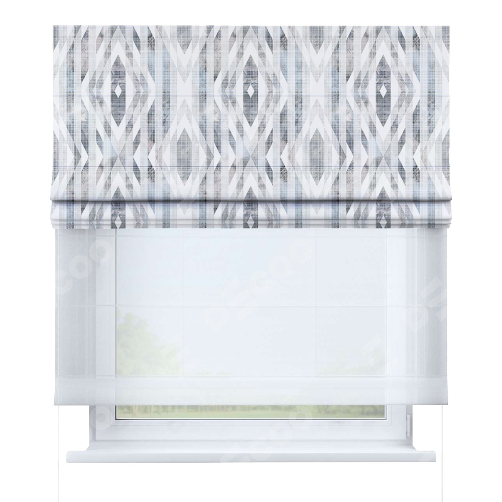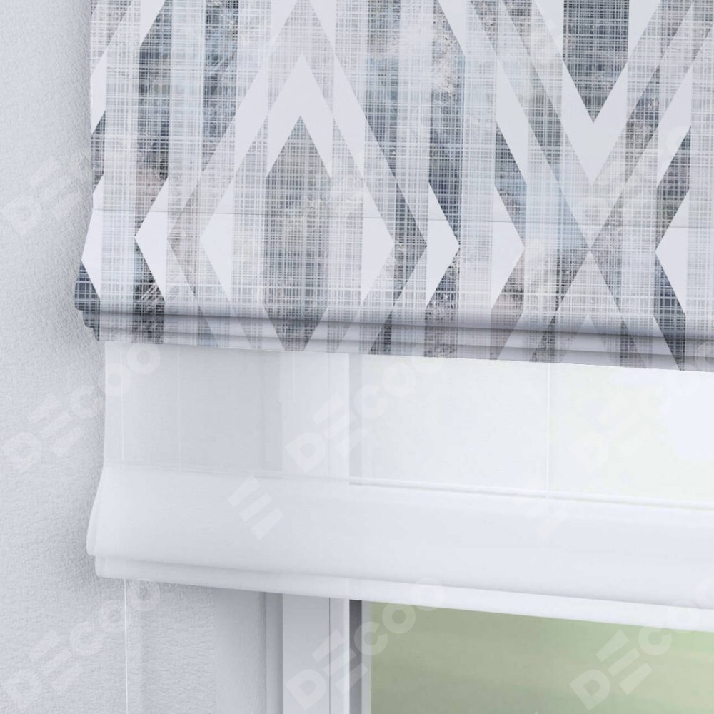Двойная римская штора «День-ночь» от производителя Cortin предназначена для использования в проёмах. Эта штора уникальна тем, что состоит из двух полотен. На лицевой стороне находится блэкаут с нанесением сублимационной печати «Триумф», обеспечивающий эффективное затемнение. В комплект также входит вторая ткань — легкий белый тюль (артикул: V-01), который добавляет изящества и легкости оформлению окна. Кроме того, доступны и другие разновидности ткани тюль, выбор которых доступен по  ссылке .