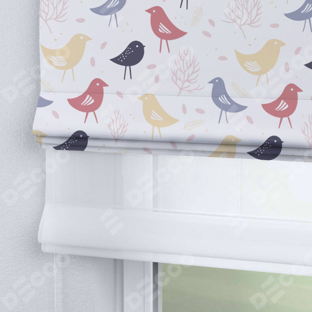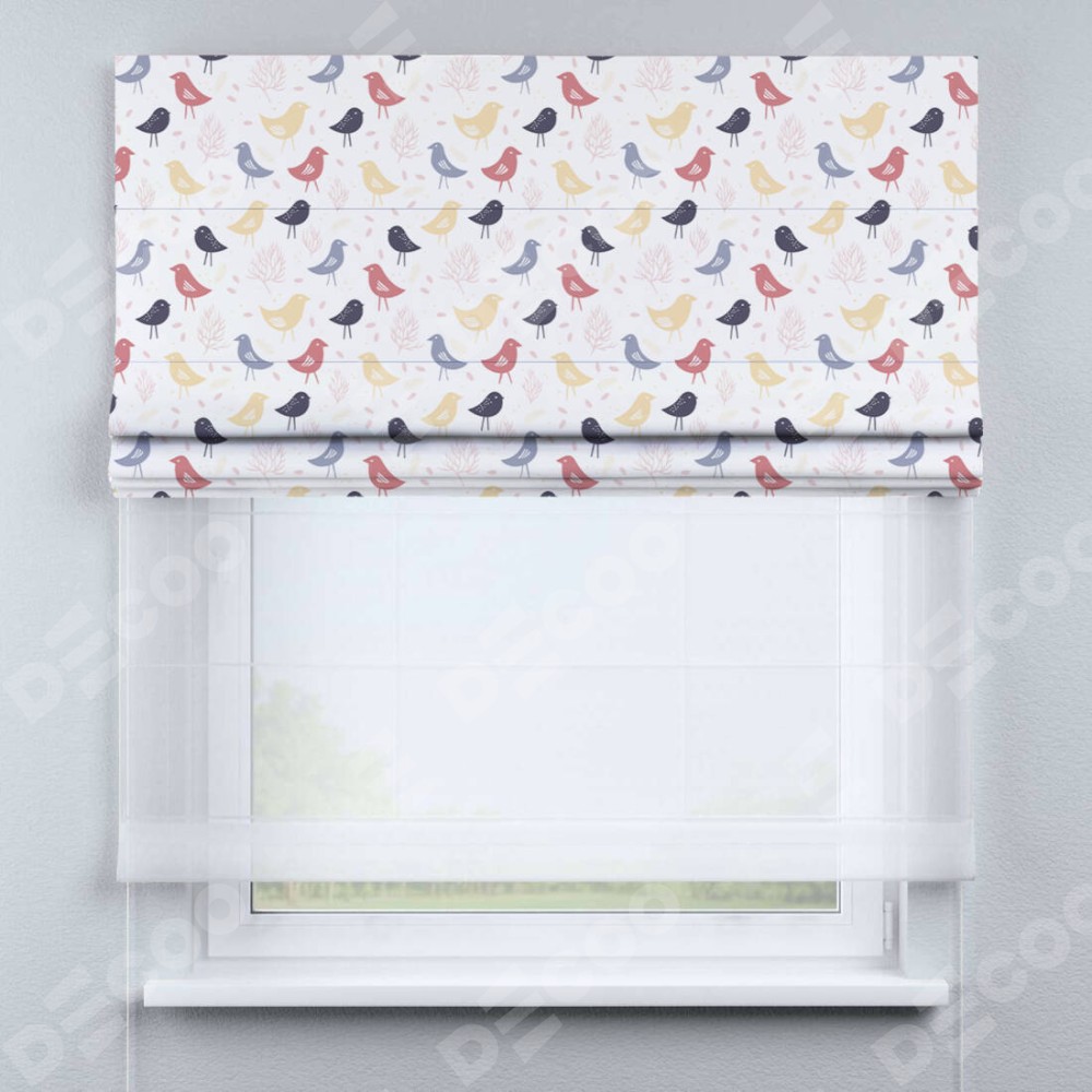 Двойная римская штора «День-ночь» от производителя Cortin предназначена для использования в проёмах. Эта штора уникальна тем, что состоит из двух полотен. На лицевой стороне находится блэкаут с нанесением сублимационной печати «Цветные птички», обеспечивающий эффективное затемнение. В комплект также входит вторая ткань — легкий белый тюль (артикул: V-01), который добавляет изящества и легкости оформлению окна. Кроме того, доступны и другие разновидности ткани тюль, выбор которых доступен по  ссылке .
