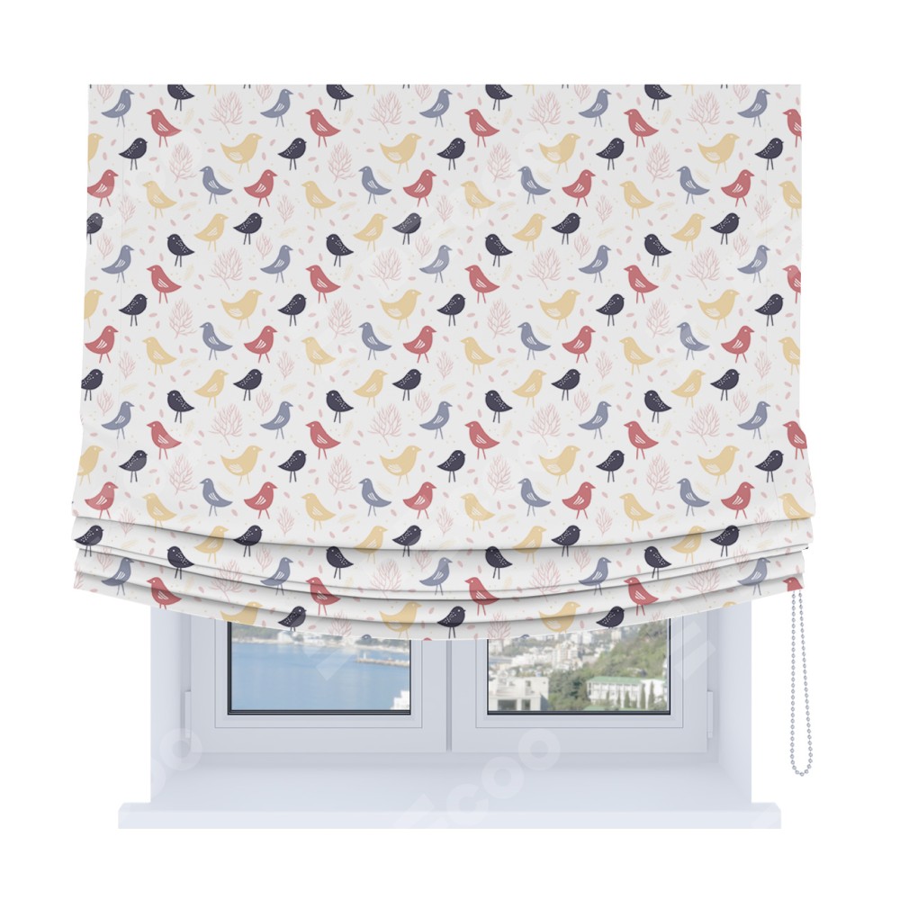 Римская штора Soft производителя «Cortin», используется для проёма, пошита из ткани блэкаут с нанесением сублимационной печати «Цветные птички». Имеет универсальный механизм и подходит для монтажа: на потолок, на стену и в нишу. В отличие от стандартных римских штор, римская штора Soft не имеет горизонтальных вставок и нижнего отвеса. Это позволяет ткани произвольно драпироваться в свободные мягкие складки.