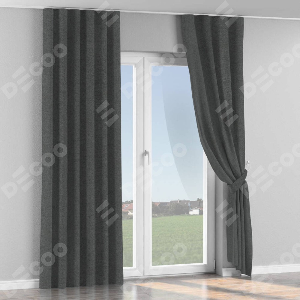 Комплект прямых штор, от производителя «Cortin», пошиты из ткани твид блэкаут тёмно-серый, артикул ткани 90938. С изнаночной стороны в верхней части штор пристрачивается шторная лента с декоративными складками «Волна». Для создания элегантных складок прямые шторы шьются по стандарту с коэффициентом 1:2 (на 100 см. ширины проёма 200 см. ширины ткани).