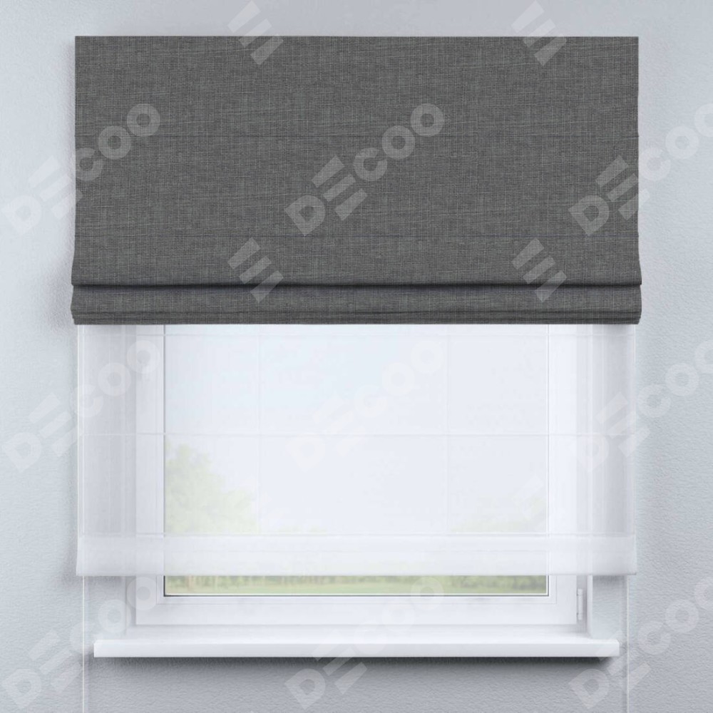 Двойная римская штора «День-ночь» от производителя Cortin предназначена для использования в проёмах. Эта штора уникальна тем, что состоит из двух полотен. На лицевой стороне находится лён тёмно-серый (артикул: 7441), обеспечивающий мягкое затемнение. В комплект также входит вторая ткань — легкий белый тюль (артикул: V-01), который добавляет изящества и легкости оформлению окна. Кроме того, доступны и другие разновидности ткани тюль, выбор которых доступен по ссылке .