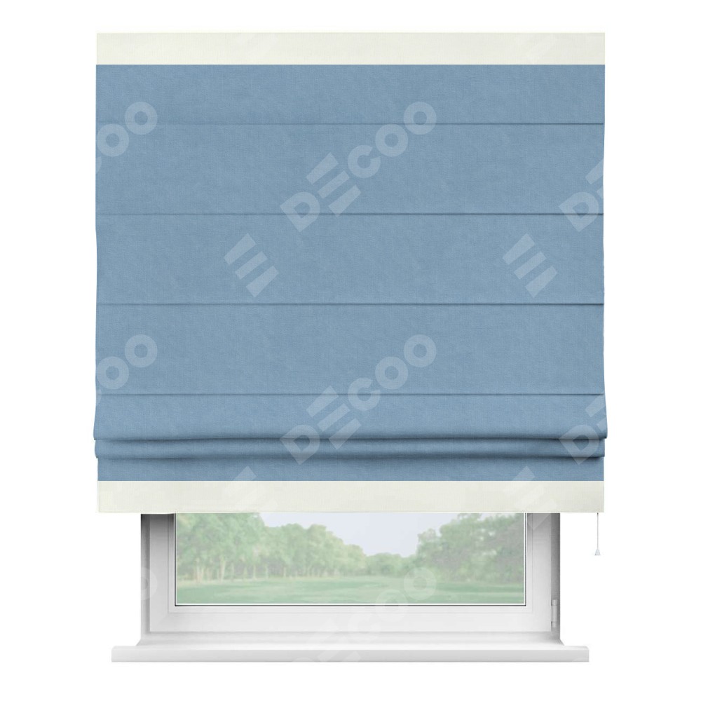 Римская штора производителя «Cortin», используется для проёма, пошита из ткани канвас голубой, артикул ткани 92729. Отделка шторы кантом «Горизонт» (молочный v-93), ткань для канта используется из канваса разной расцветки на выбор. Имеет универсальный механизм и подходит для монтажа: на потолок, на стену и в нишу.