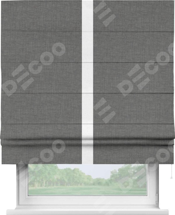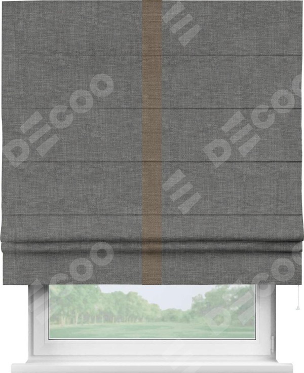 Римская штора производителя «Cortin», используется для проёма, пошита из ткани лён тёмно-серый, артикул 7441. Отделка шторы кантом «Хайвэй», ткань для канта используется из льна разной расцветки на выбор. Имеет универсальный механизм и подходит для монтажа: на потолок, на стену и в нишу.