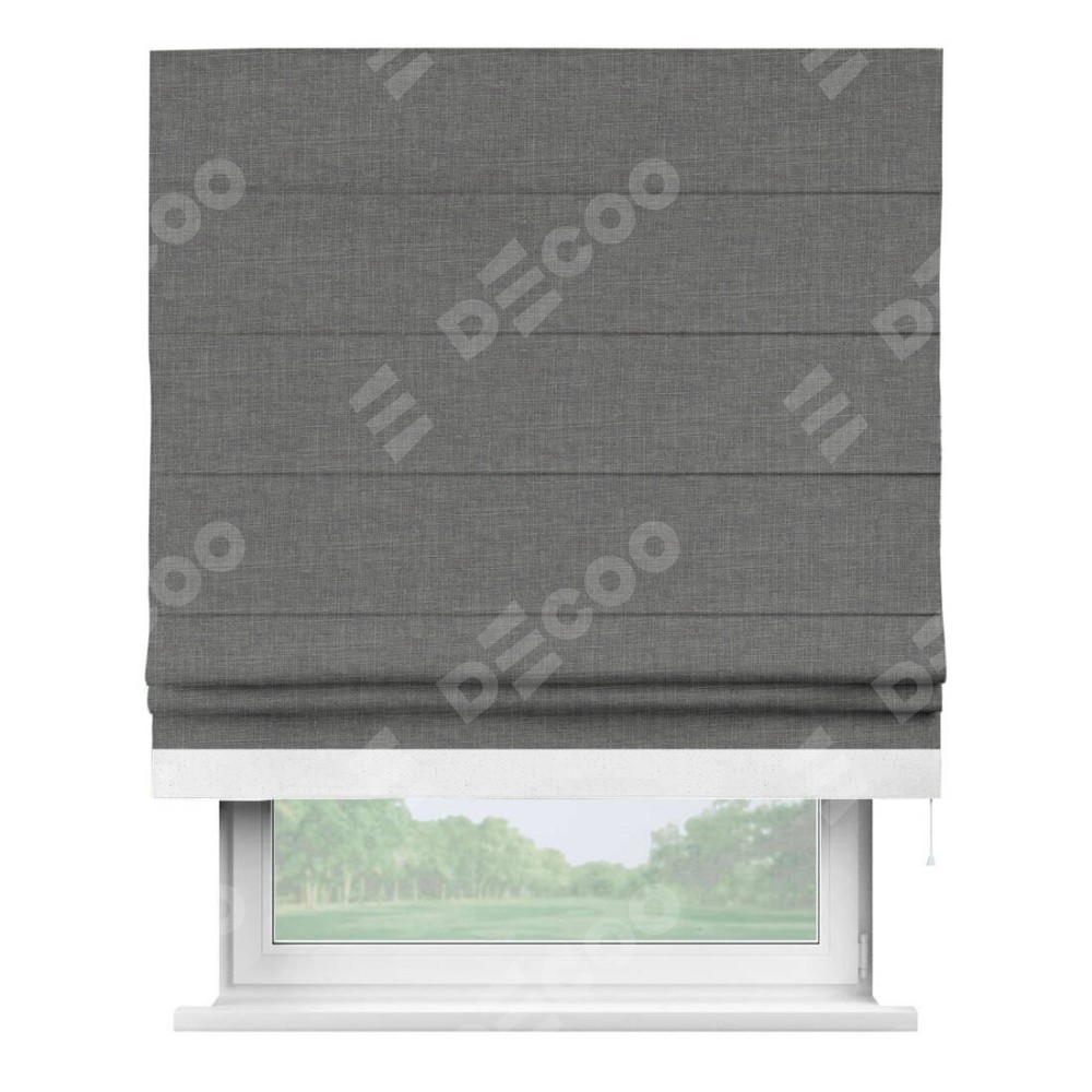 Римская штора производителя «Cortin», используется для проёма, пошита из ткани лён тёмно-серый, артикул 7441. Отделка шторы кантом «Джестер», ткань для канта используется из льна разной расцветки на выбор. Имеет универсальный механизм и подходит для монтажа: на потолок, на стену и в нишу.