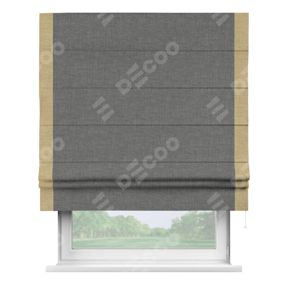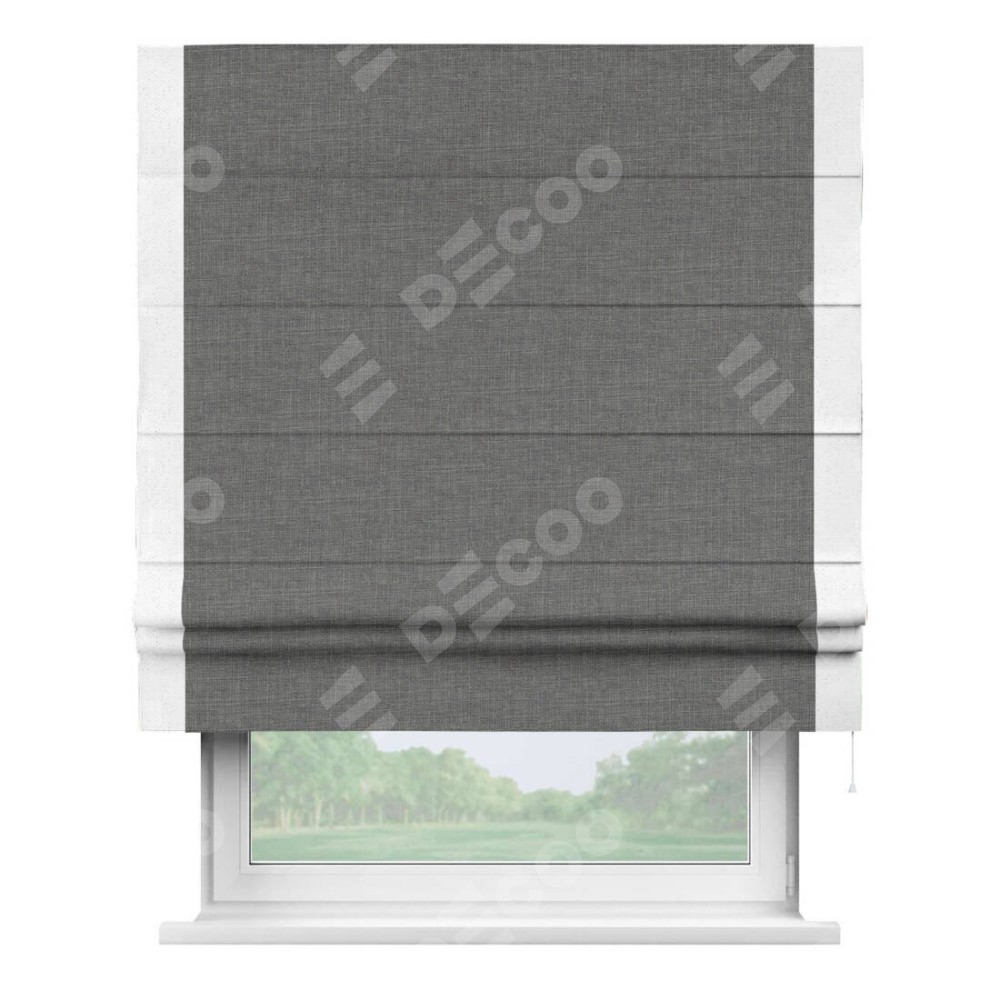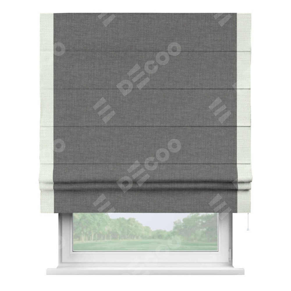 Римская штора производителя «Cortin», используется для проёма, пошита из ткани лён тёмно-серый, артикул 7441. Отделка шторы кантом «Стрим Дуо», ткань для канта используется из льна разной расцветки на выбор. Имеет универсальный механизм и подходит для монтажа: на потолок, на стену и в нишу.