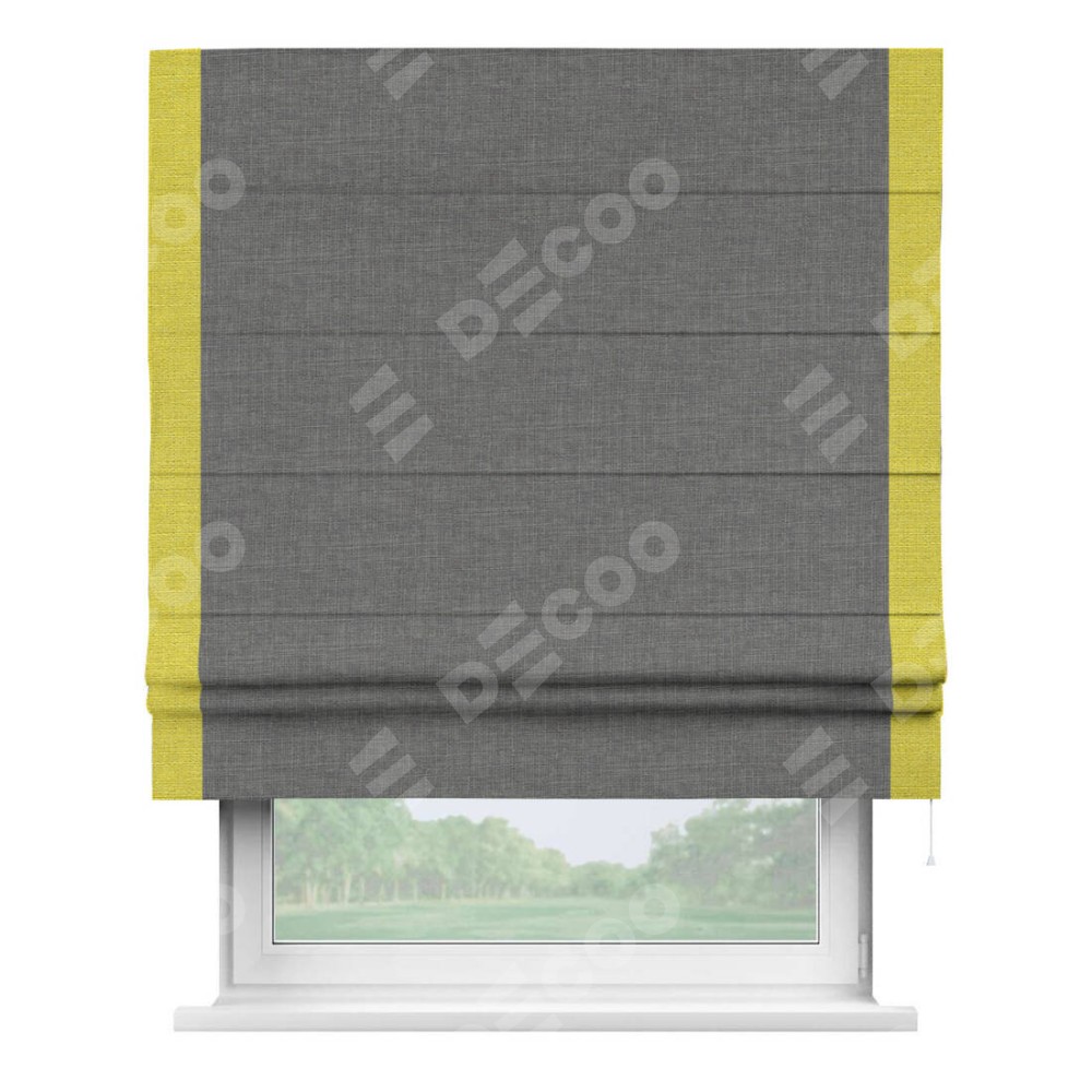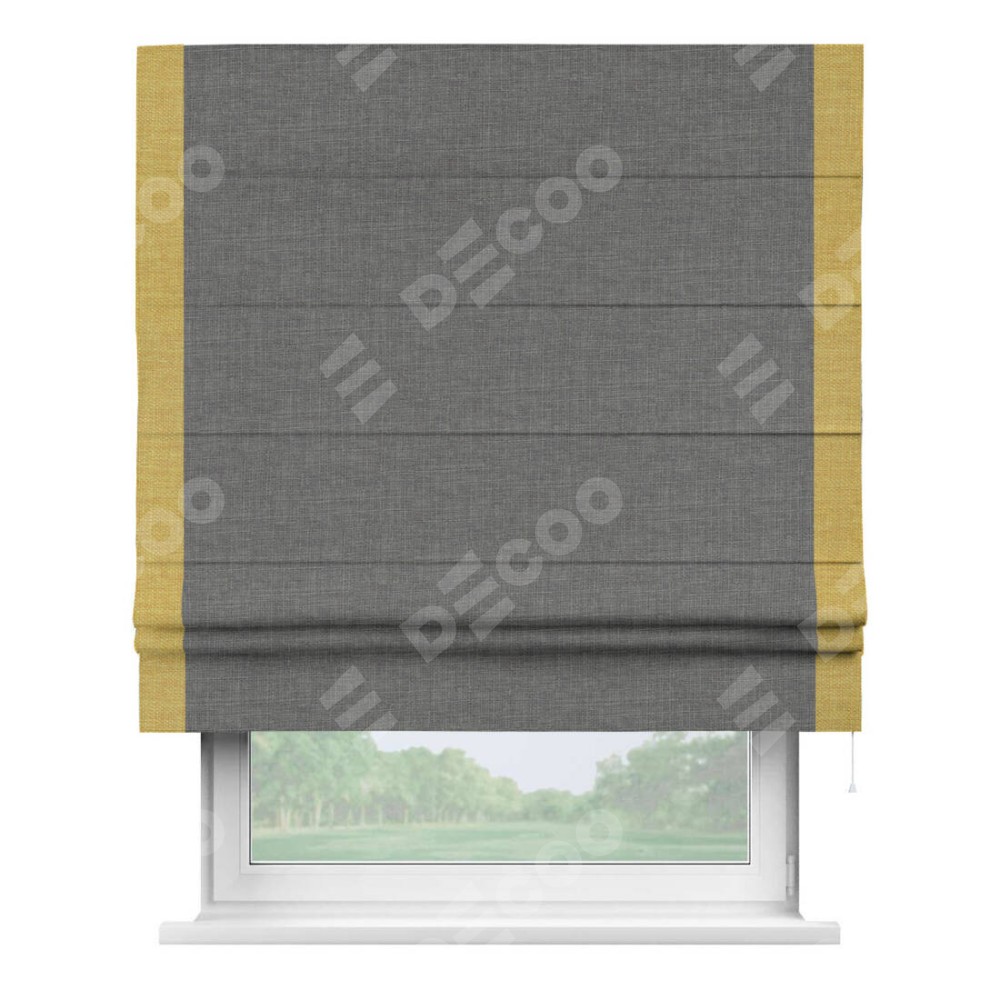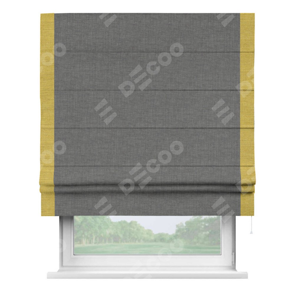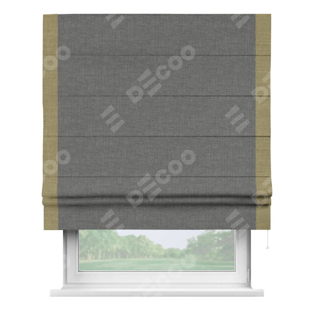 Римская штора производителя «Cortin», используется для проёма, пошита из ткани лён тёмно-серый, артикул 7441. Отделка шторы кантом «Стрим Дуо», ткань для канта используется из льна разной расцветки на выбор. Имеет универсальный механизм и подходит для монтажа: на потолок, на стену и в нишу.