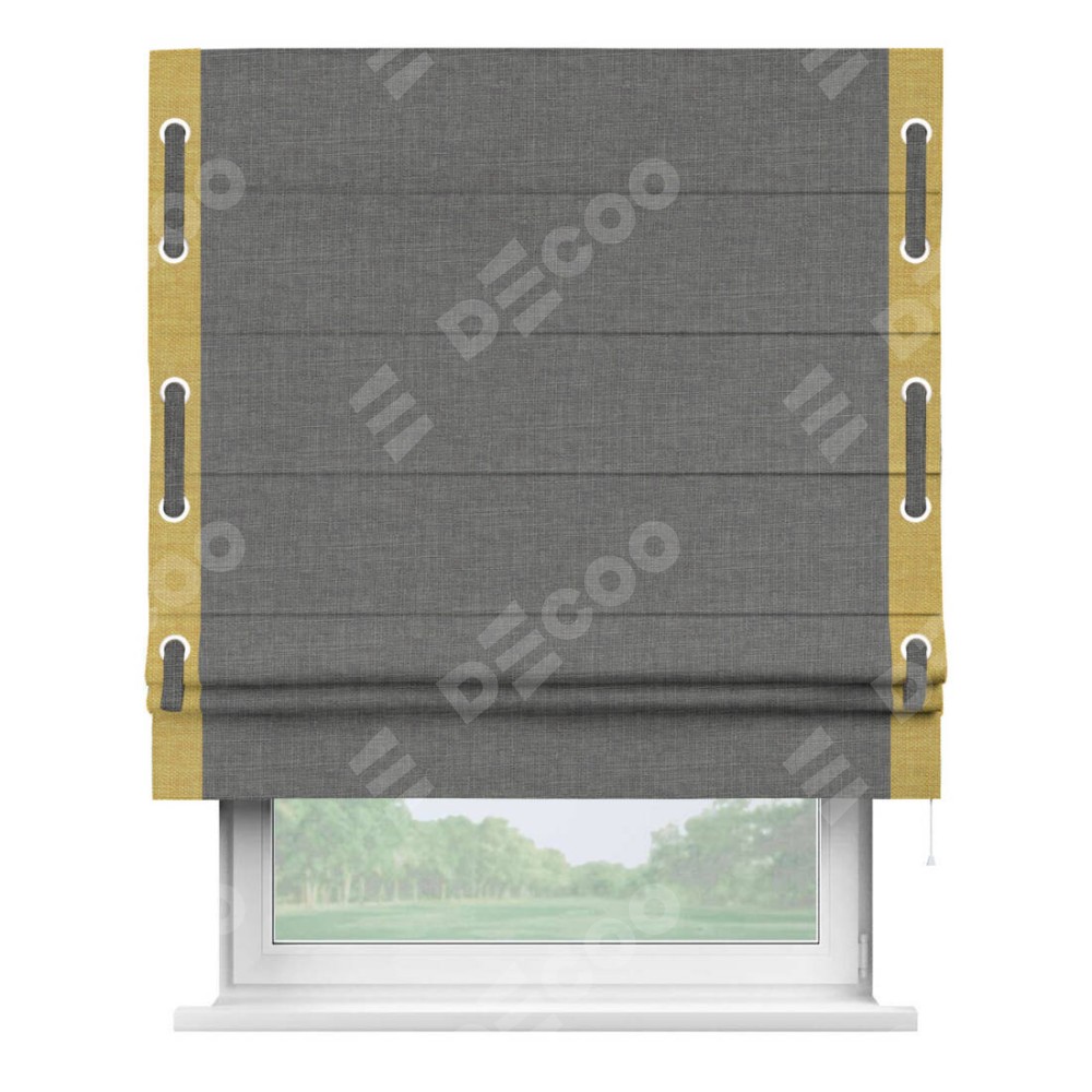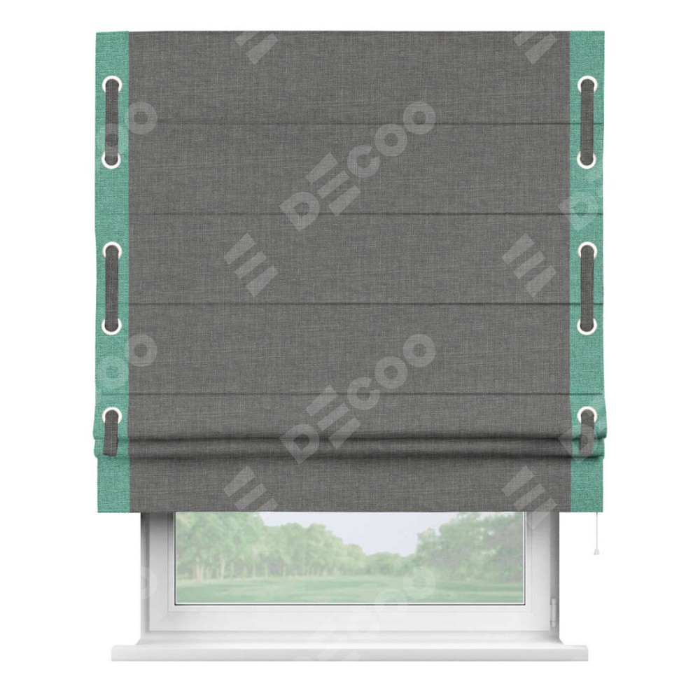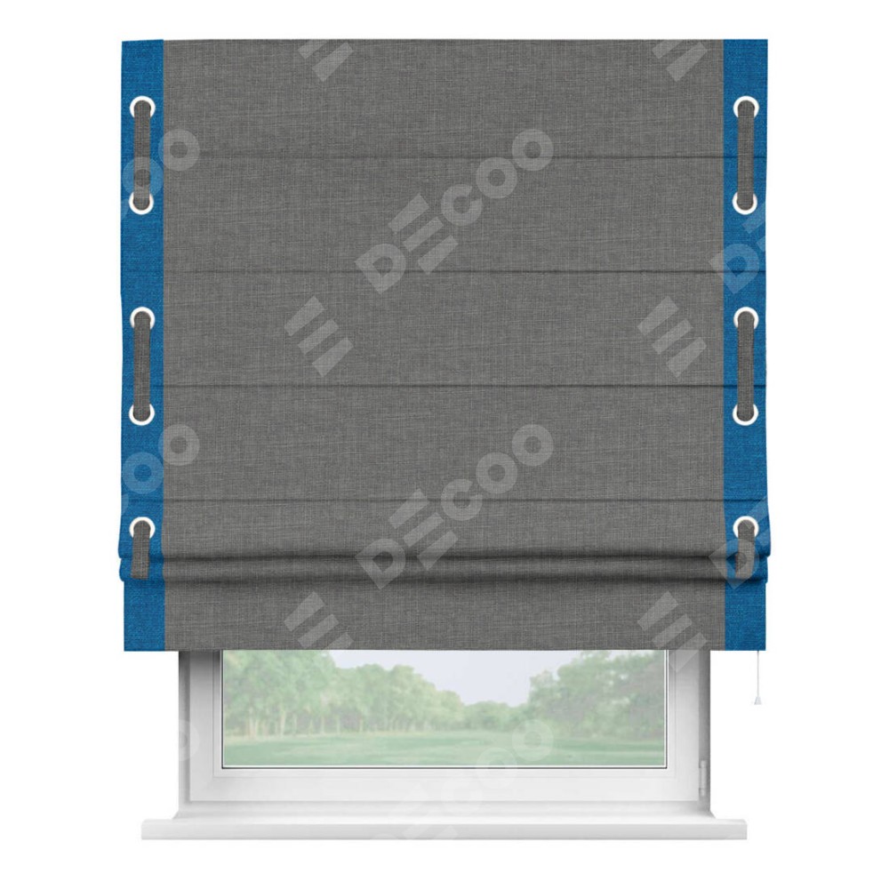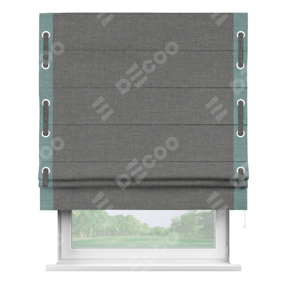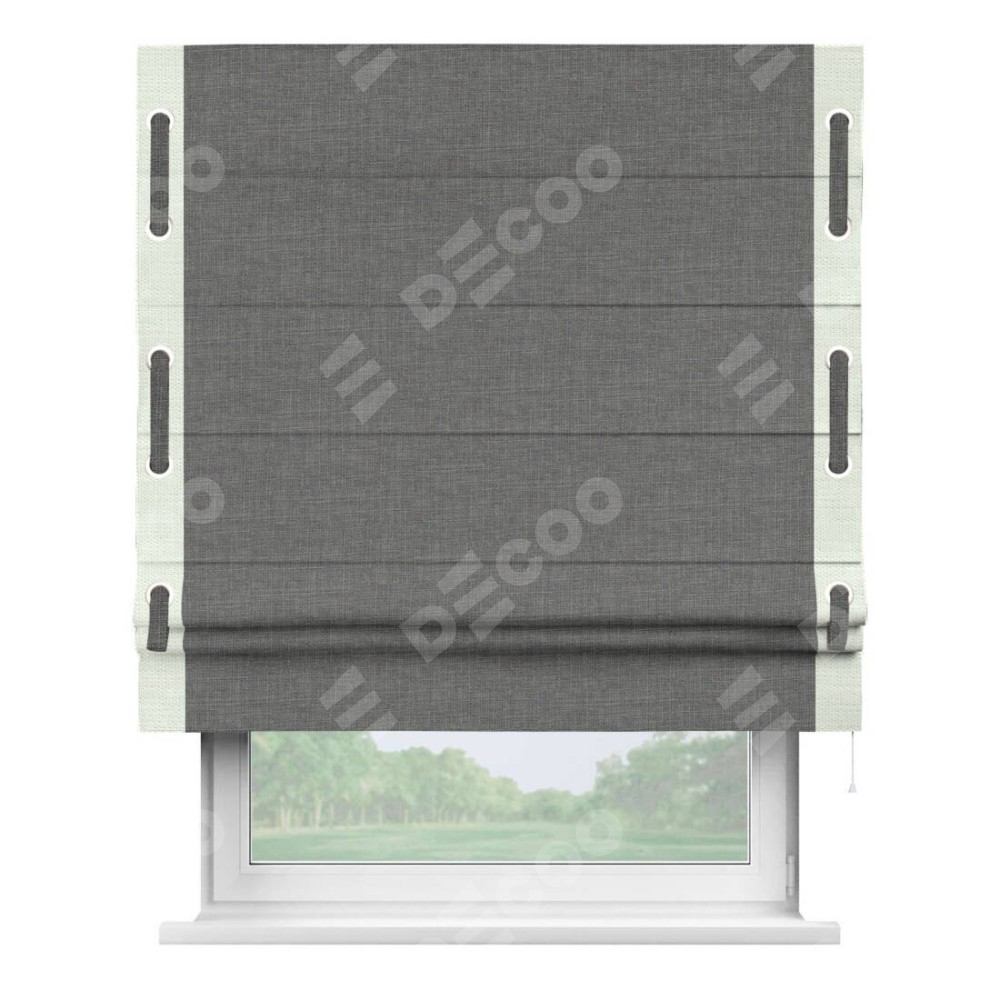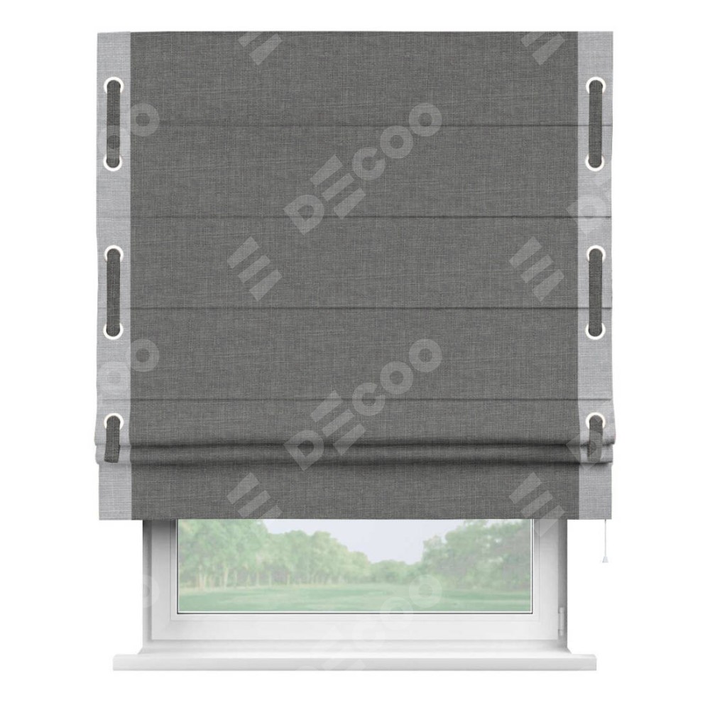 Римская штора производителя «Cortin», используется для проёма, пошита из ткани лён тёмно-серый, артикул 7441. Отделка шторы кантом «Стрим Дуо» на кантах расположены люверсы с пояском, ткань для канта используется из льна разной расцветки на выбор. Ткань для пояска обычно используется из основной ткани шторы, а так же можно сделать из любой расцветки по желанию. Имеет универсальный механизм и подходит для монтажа: на потолок, на стену и в нишу.
