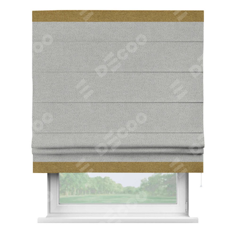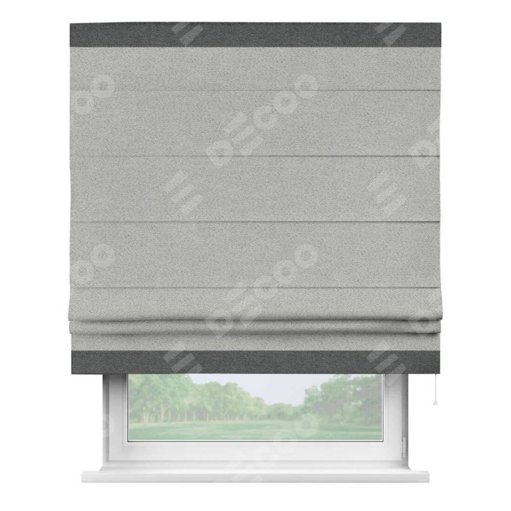 Римская штора производителя «Cortin», используется для проёма, пошита из ткани твид блэкаут светло-серый, артикул 90936. Отделка шторы кантом «Горизонт», ткань для канта используется из твида разной расцветки на выбор. Имеет универсальный механизм и подходит для монтажа: на потолок, на стену и в нишу.
