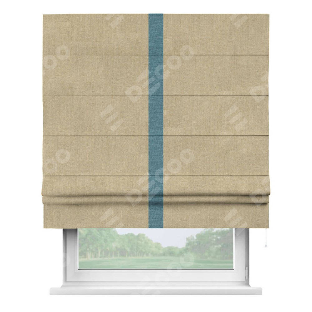 Римская штора пошита из ткани лён димаут песочный, артикул: 16256, с отделкой кантом «Хайвэй» представляет собой уникальное и смелое дизайнерское решение, где кант расположен вертикально посередине шторы. Этот дизайн не только выделяет штору среди других вариантов оформления окон, но и создает интересный визуальный акцент, привлекая внимание к центру окна и разделяя штору на визуальные зоны. Такой нестандартный подход добавляет динамичности интерьеру и может быть использован для подчеркивания особенностей оформления помещения.