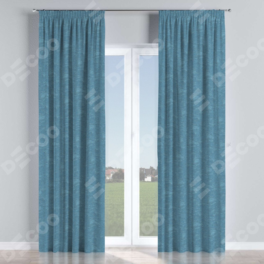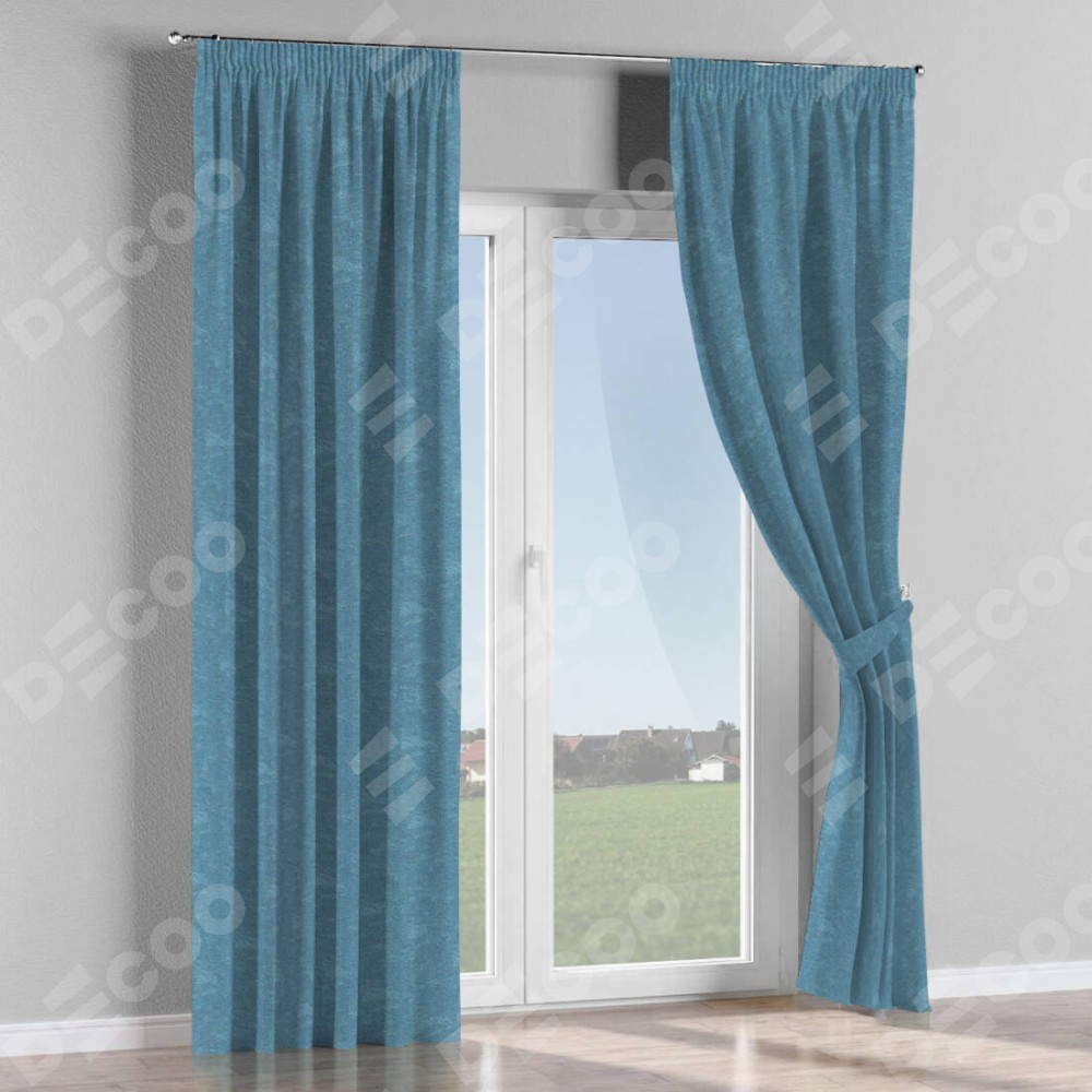 Комплект прямых штор, от производителя «Cortin», пошиты из ткани софт мрамор голубой, артикул ткани 93580. С изнаночной стороны в верхней части штор пристрачивается шторная лента с декоративными складками «Карандаш». Для создания элегантных складок прямые шторы шьются по стандарту с коэффициентом 1:2 (на 100 см. ширины проёма 200 см. ширины ткани).