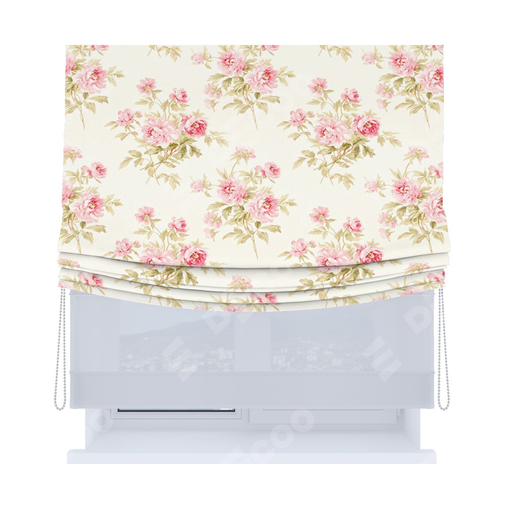 Римская штора день-ночь производителя «Cortin», используется для проёма, пошита из двух полотен, с лицевой блэкаут с нанесением сублимационной печати «Английский шебби-шик», вторая ткань тюль (по стандарту комплектуется тюль белого цвета артикул V-01). Имеет универсальный механизм и подходит для монтажа: на потолок, на стену и в нишу. Удобное управление каждой шторой отдельно.