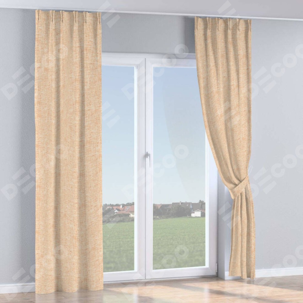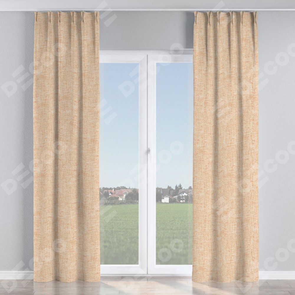 Комплект прямых штор, от производителя «Cortin», пошиты из ткани рогожка димаут персиковый, артикул ткани 91016. С изнаночной стороны в верхней части штор пристрачивается шторная лента с декоративными складками «Кустик». Для создания элегантных складок прямые шторы шьются по стандарту с коэффициентом 1:2 (на 100 см. ширины проёма 200 см. ширины ткани).