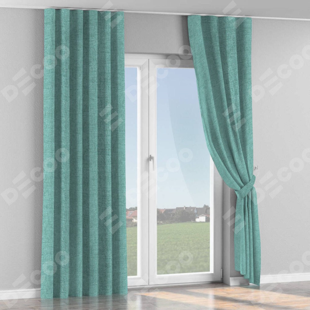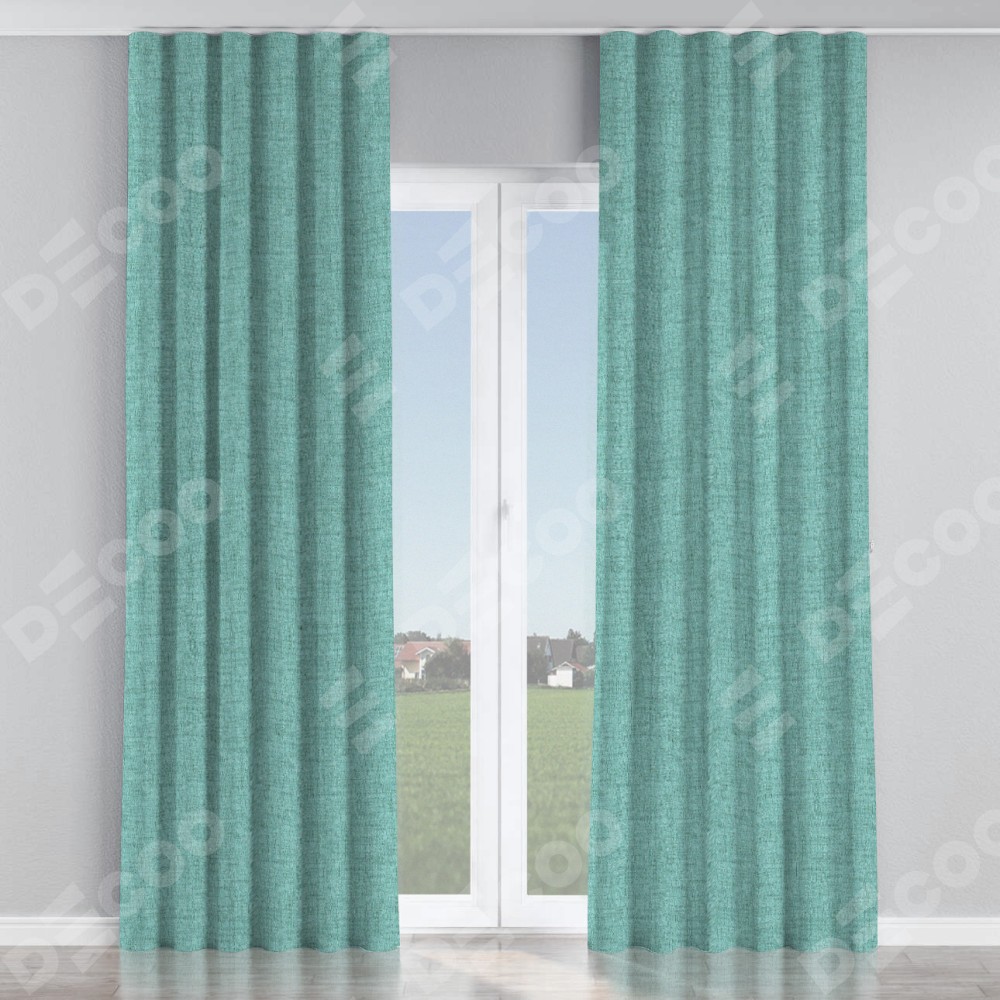 Комплект прямых штор, от производителя «Cortin», пошиты из ткани рогожка димаут аквамариновый крайола, артикул ткани 91023. С изнаночной стороны в верхней части штор пристрачивается шторная лента с декоративными складками «Волна». Для создания элегантных складок прямые шторы шьются по стандарту с коэффициентом 1:2 (на 100 см. ширины проёма 200 см. ширины ткани).