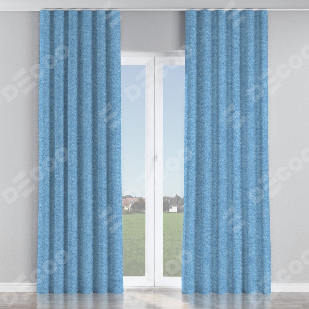 Комплект прямых штор, от производителя «Cortin», пошиты из ткани рогожка димаут голубой, артикул ткани 91025. С изнаночной стороны в верхней части штор пристрачивается шторная лента с декоративными складками «Волна». Для создания элегантных складок прямые шторы шьются по стандарту с коэффициентом 1:2 (на 100 см. ширины проёма 200 см. ширины ткани).