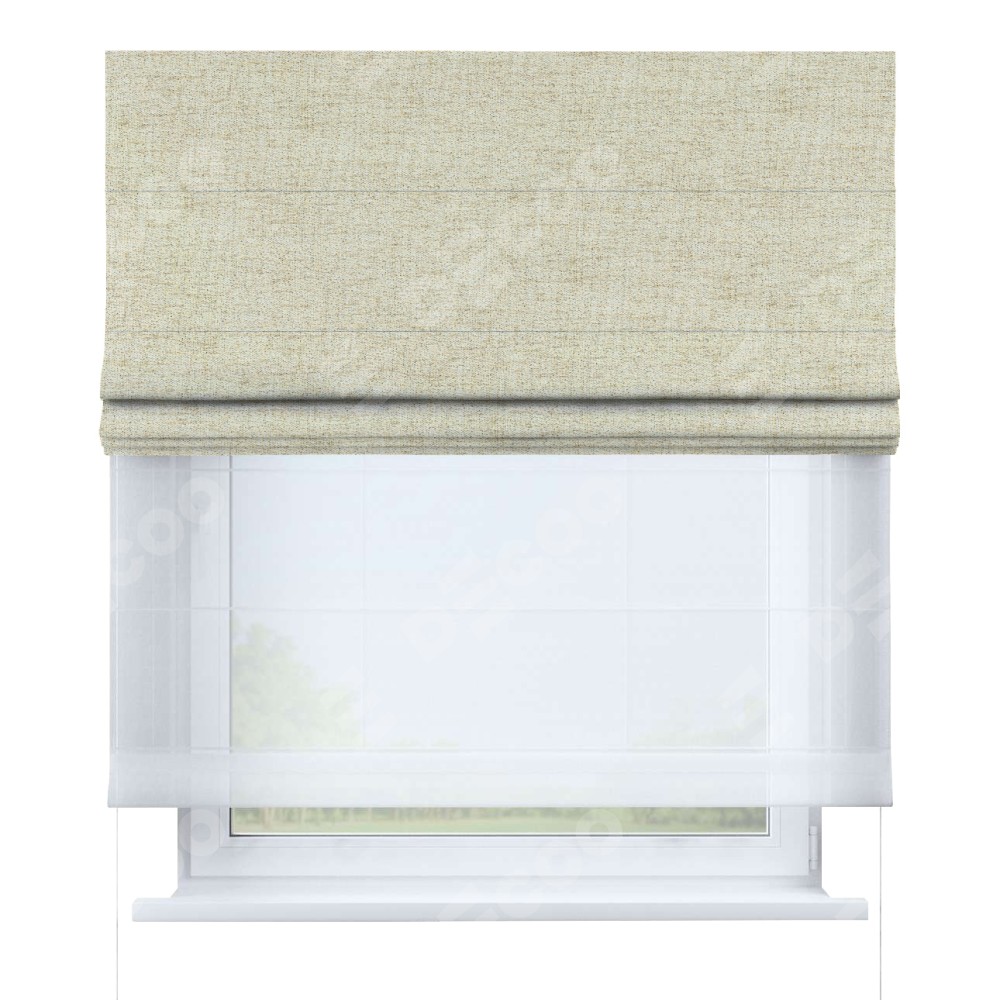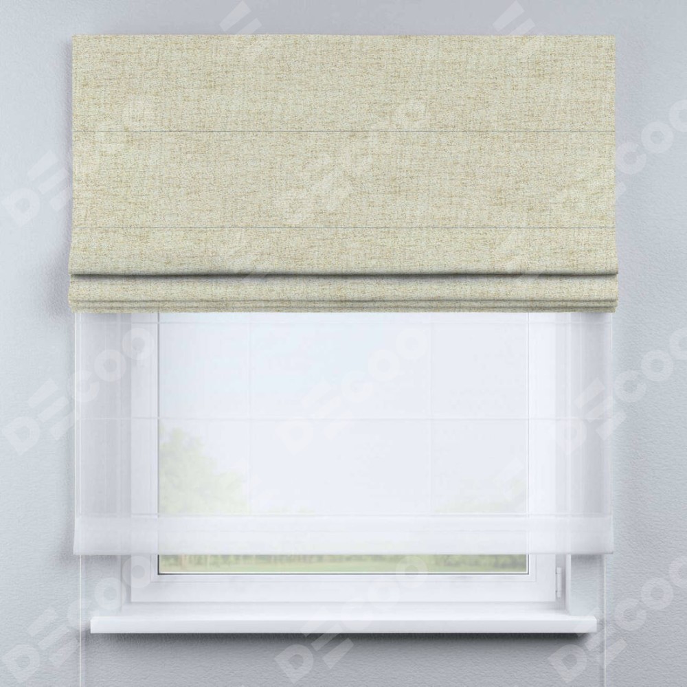 Двойная римская штора «День-ночь» от производителя Cortin предназначена для использования в проёмах. Эта штора уникальна тем, что состоит из двух полотен. На лицевой стороне находится рогожка димаут золотой песок (артикул: 91015), обеспечивающий эффективное затемнение. В комплект также входит вторая ткань — легкий белый тюль (артикул: V-01), который добавляет изящества и легкости оформлению окна. Кроме того, доступны и другие разновидности ткани тюль, выбор которых доступен по  ссылке .