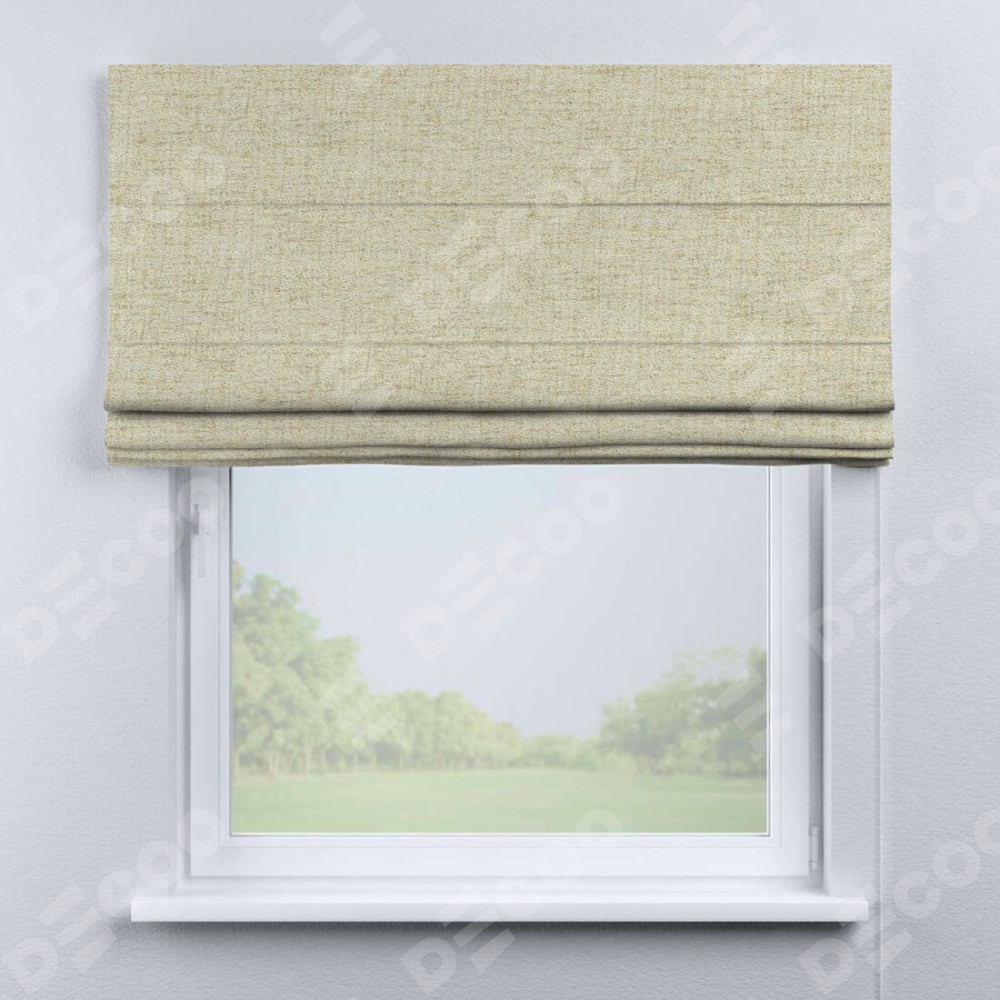 Классическая римская штора производителя «Cortin», пошита из ткани рогожка димаут золотой песок, артикул: 91015. Имеет универсальный механизм и подходит для монтажа: на потолок, на стену и в нишу.
