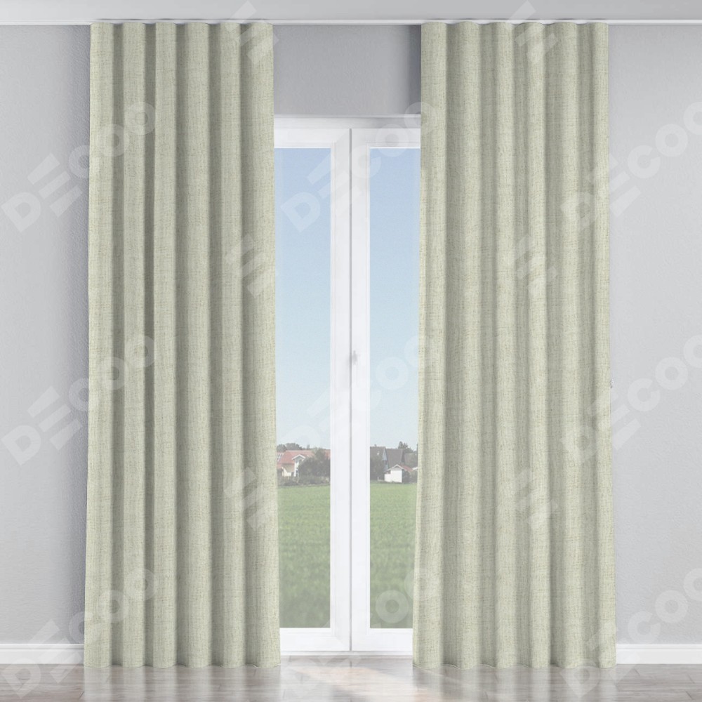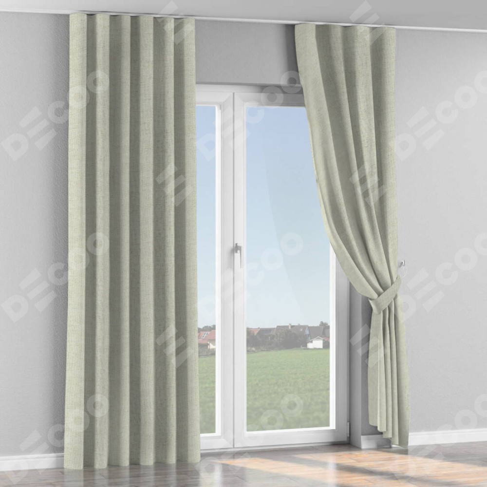 Комплект прямых штор, от производителя «Cortin», пошиты из ткани рогожка димаут серо-бежевый, артикул ткани 91014. С изнаночной стороны в верхней части штор пристрачивается шторная лента с декоративными складками «Волна». Для создания элегантных складок прямые шторы шьются по стандарту с коэффициентом 1:2 (на 100 см. ширины проёма 200 см. ширины ткани).