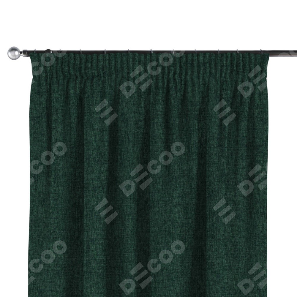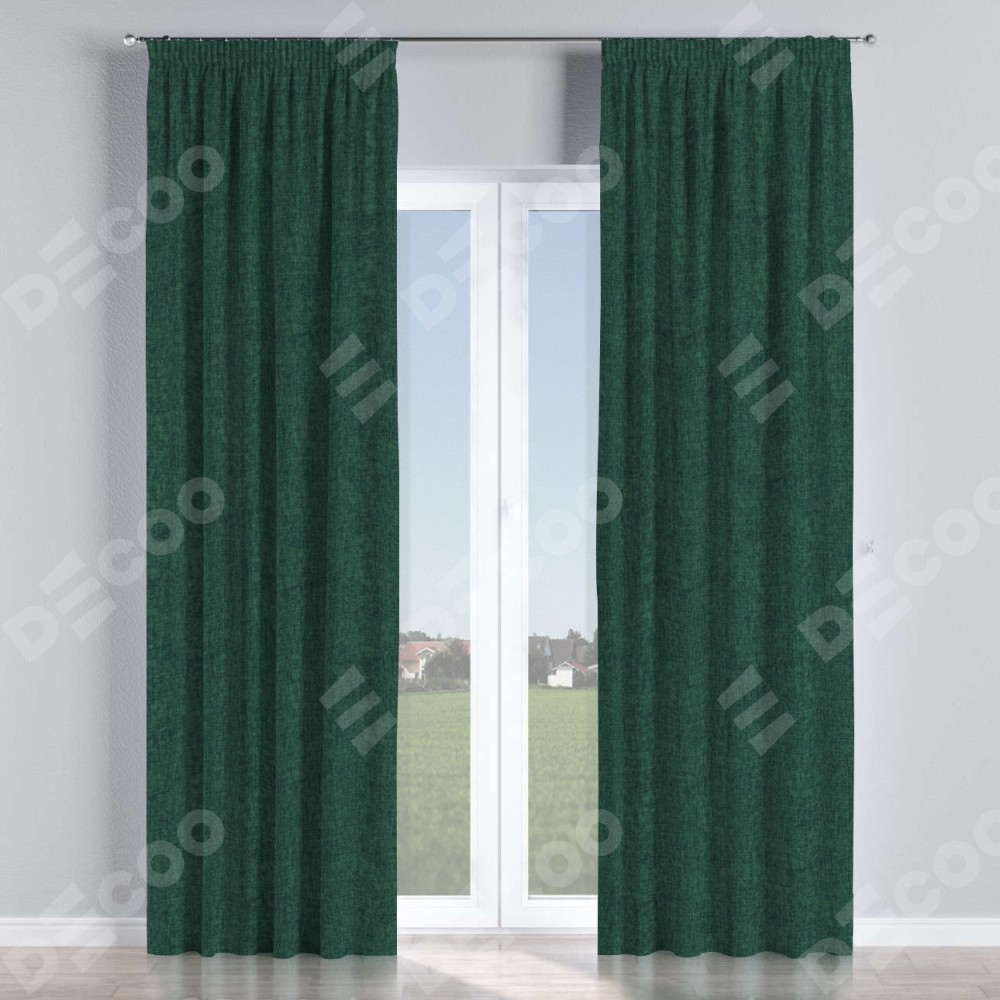 Комплект прямых штор, от производителя «Cortin», пошиты из ткани рогожка димаут тёмно-зелёный, артикул ткани 91022. С изнаночной стороны в верхней части штор пристрачивается шторная лента с декоративными складками «Карандаш». Для создания элегантных складок прямые шторы шьются по стандарту с коэффициентом 1:2 (на 100 см. ширины проёма 200 см. ширины ткани).
