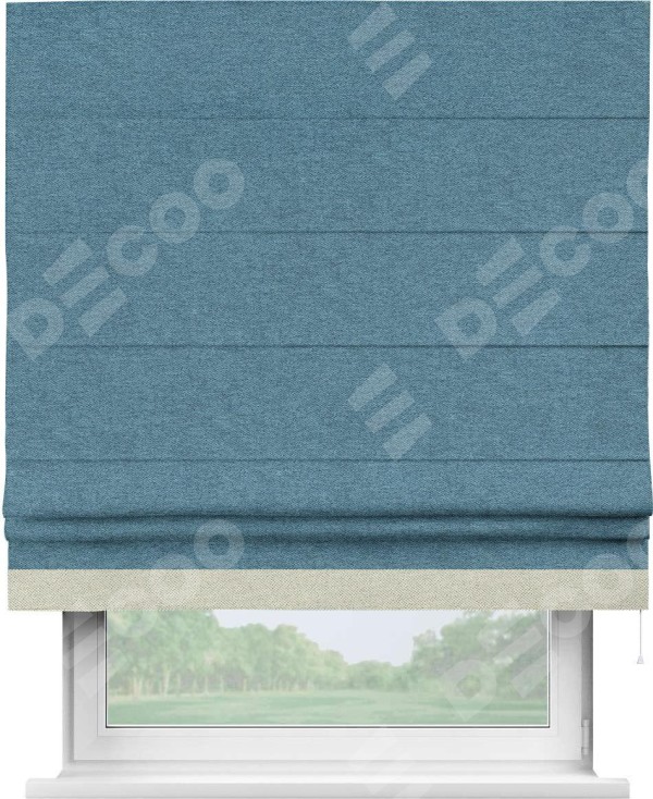 Римская штора пошита из ткани твид блэкаут светло-синий, артикул: 90935, с отделкой кантом «Джестер» выделяется своей уникальной особенностью — кантом, расположенным только снизу шторы. Этот дизайн добавляет оригинальности и игривости оконному оформлению, делая акцент на нижней части шторы и создавая интересный визуальный эффект. Отделка кантом на нижнем крае не только служит эстетической функции, но и способствует увеличению прочности и износостойкости ткани в этом месте.