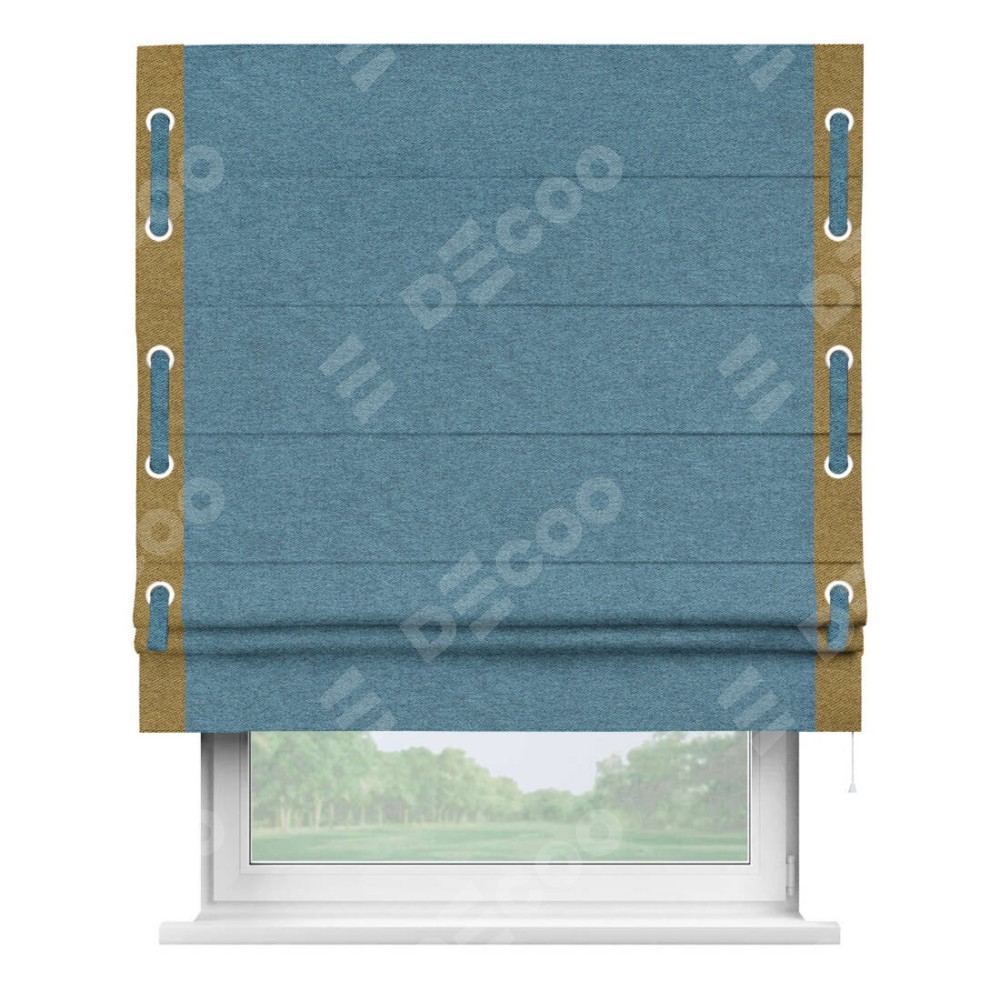 Римская штора пошита из ткани твид блэкаут светло-синий, артикул: 90935, с отделкой кантом «Стрим Дуо», дополненная декоративными люверсами на этих кантах и протянутым пояском из основного цвета римской шторы, представляет собой высоко декоративное и функциональное решение для оконного оформления. Канты, расположенные по обеим боковым сторонам шторы, уже добавляют изысканности и завершенности внешнему виду. Добавление люверсов и пояска не только усиливает декоративный эффект, но и придает шторе дополнительную текстурность и глубину.