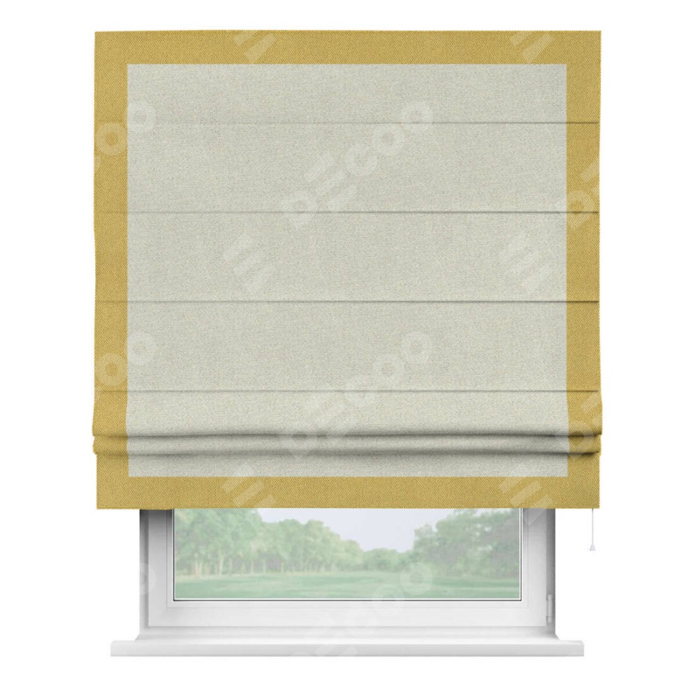 Римская штора пошита из ткани твид блэкаут шампань, артикул: 90929, с отделкой кантом «Чесс» отличается своей уникальной деталью — наличием канта не только по бокам и снизу, но и сверху по всем краям шторы. Это придает шторе особенно аккуратный и завершенный вид, делая акцент на границах и форме шторы. Отделка кантом по всему периметру шторы усиливает её декоративные качества и подчеркивает строгую геометрию, что может быть особенно актуально для современных и минималистичных интерьеров.